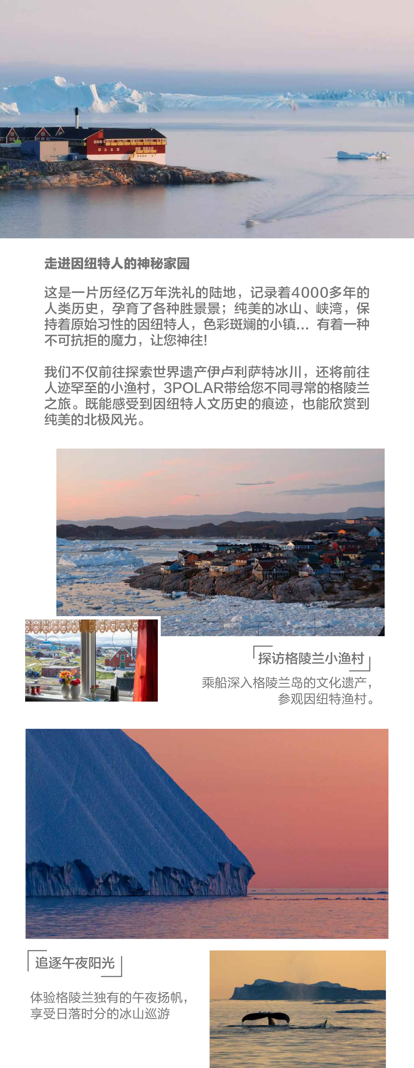 游览伊卢利萨特小镇,参观当地历史地标建筑,了解当地风土民情。在小镇街道上行走,还可从另一个角度欣赏这个美丽的峡湾城镇,冰山和冰块映着彩色的房屋,是格陵兰最具特色的景观。开启午夜阳光之旅,乘坐特种船在迪斯科湾观赏浮冰和近距离观赏壮丽的冰川峡湾。