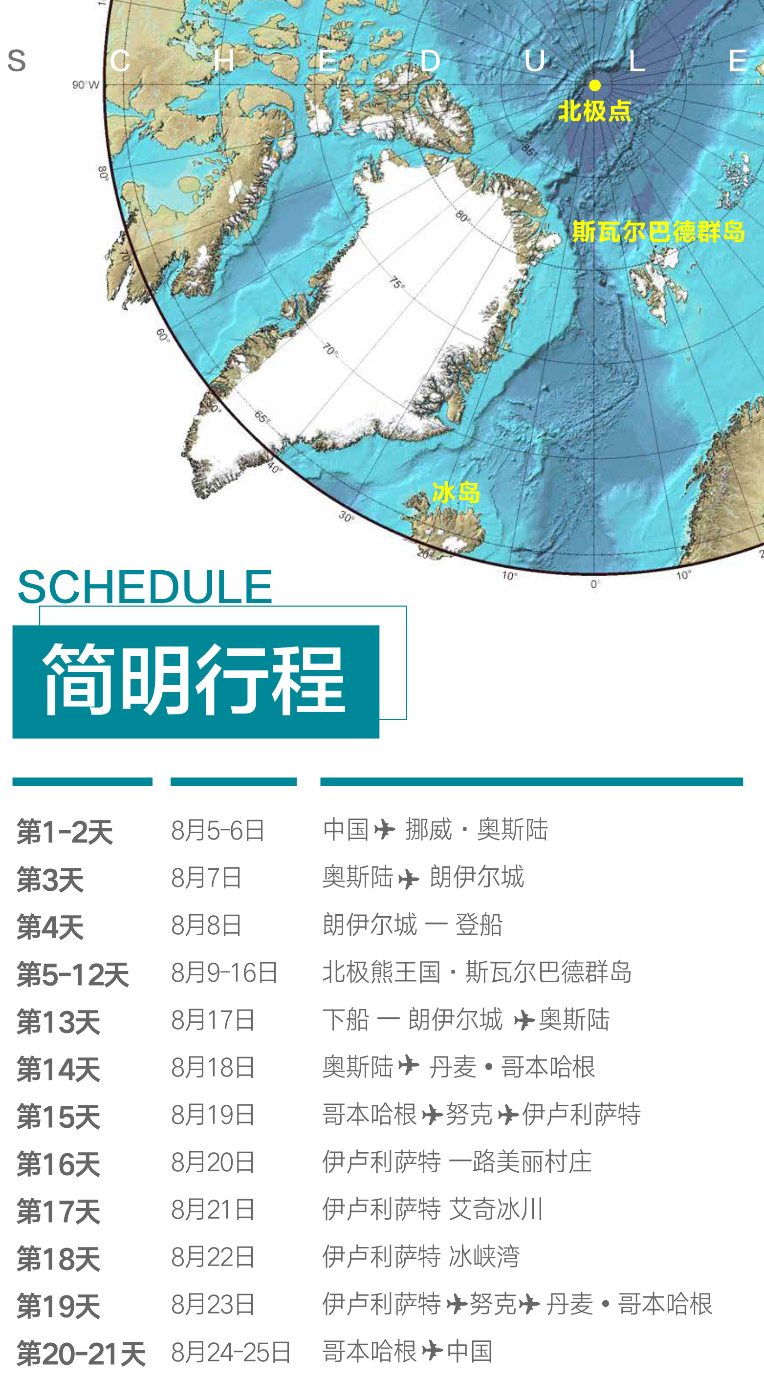 从今天起,我们的所有行程将取决于天气和冰面情 况,探访无人区,穿越北纬80度,欣赏壮丽的峡 湾、冰川和浮冰,寻觅北极熊,北极狐,驯鹿,海 象,海燕等北极特有的野生动物。 *与普通的斯瓦尔巴德线路不同,我们有更大机会 欣赏到壮观的冰瀑布和冰面上的北极熊。