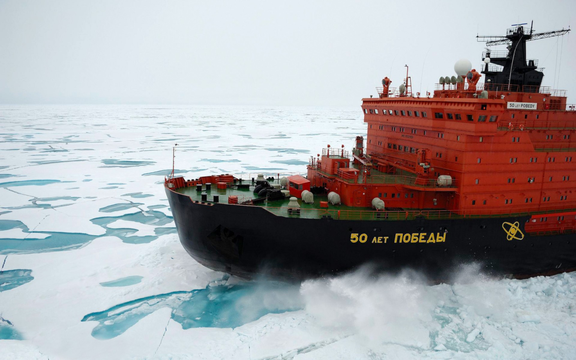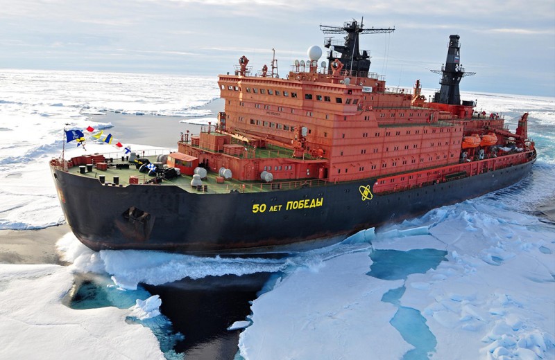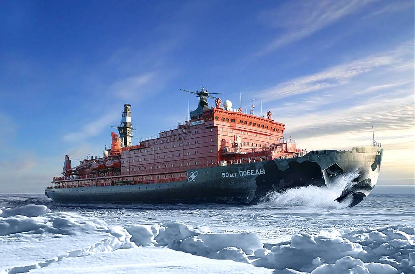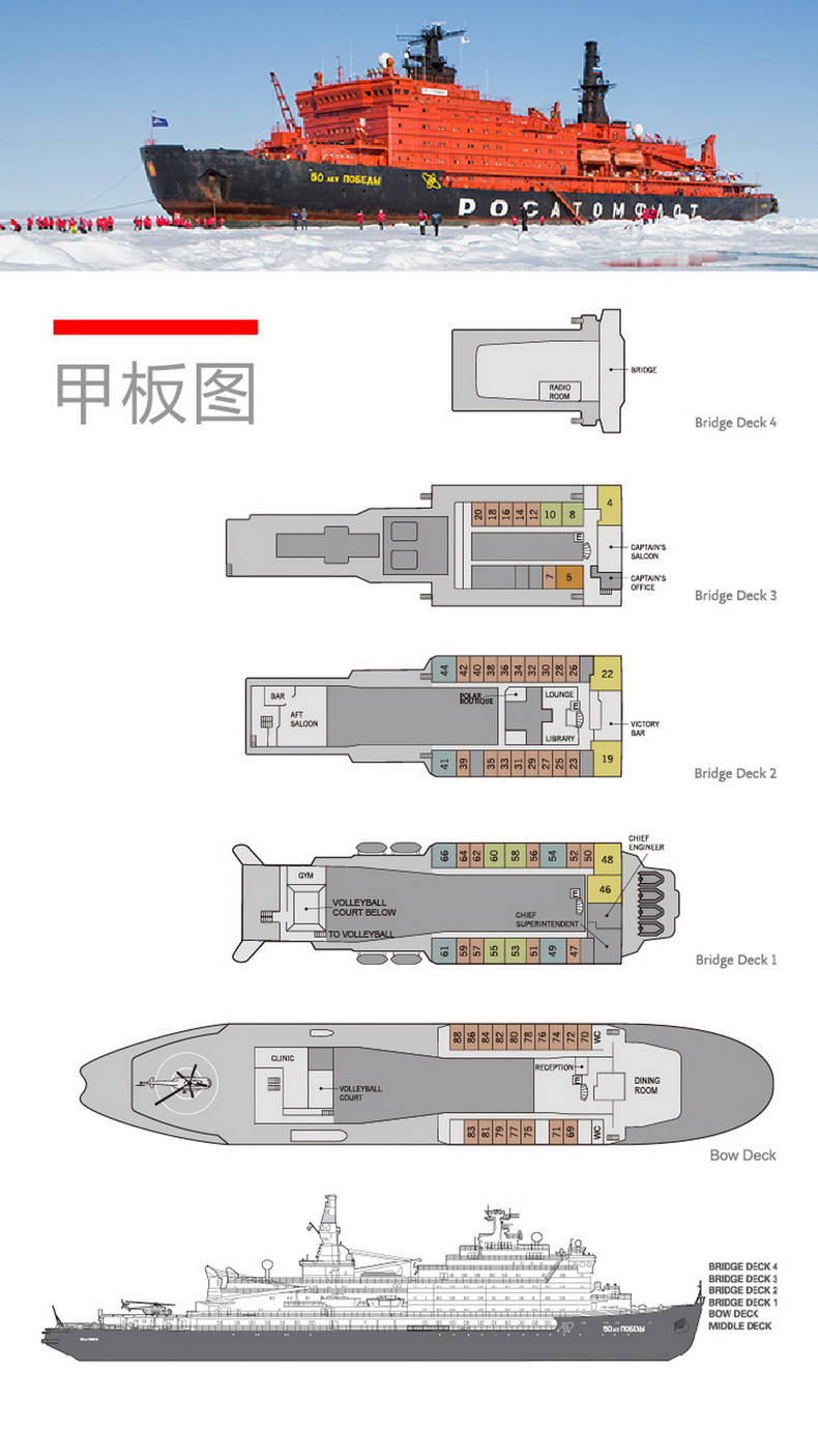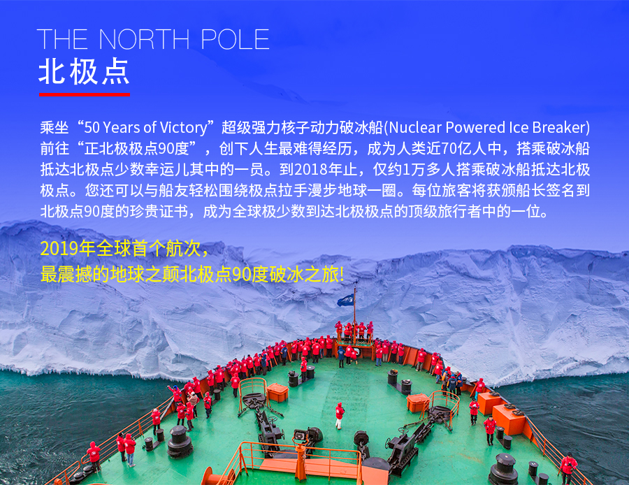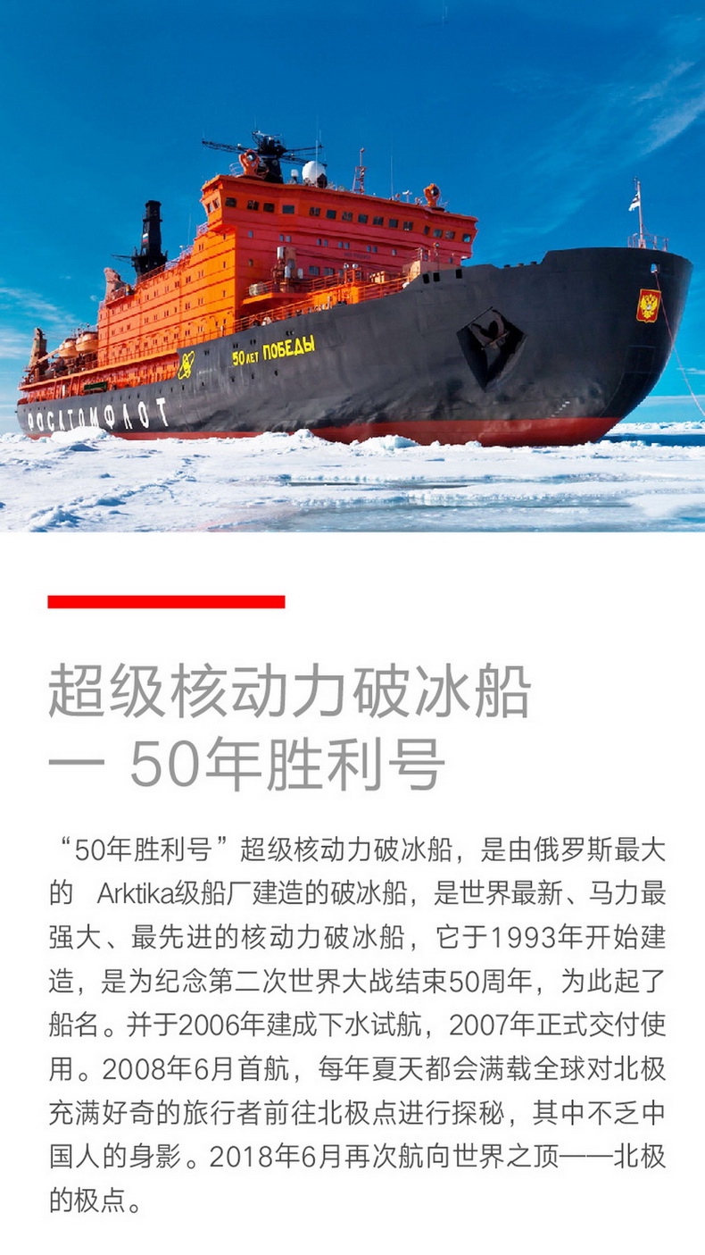 登上世界超级核子动力破冰船 “50年胜利号”。傍晚时分启航,航向地球的顶端——北极极点,船长将举行欢迎酒会,介绍船员,船上设施,享用丰盛欢迎晚宴。