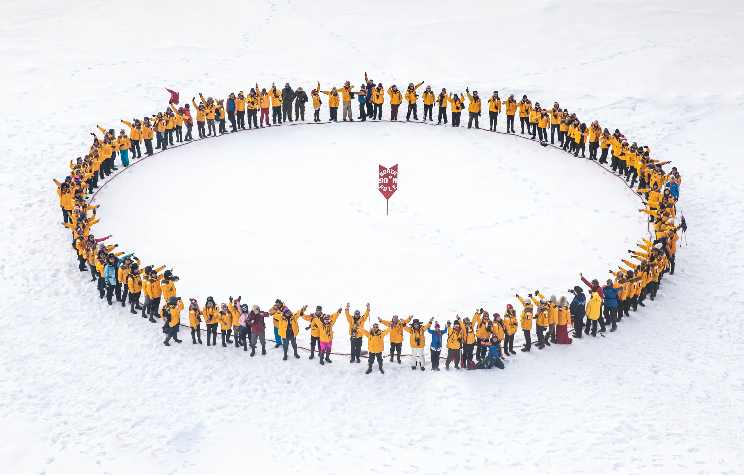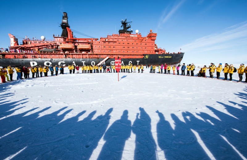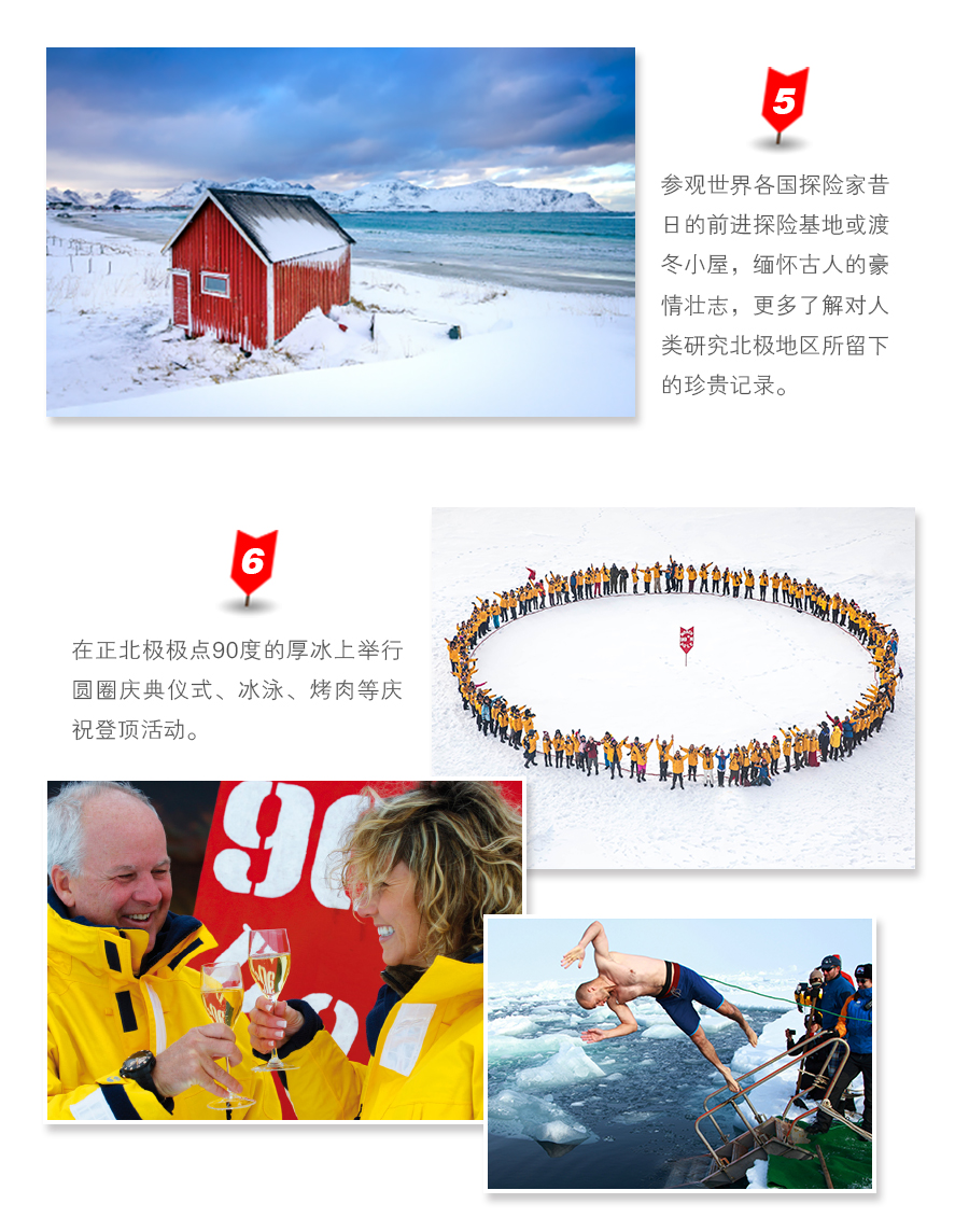 到达北极点正北90度——整个世界的巅峰!卫星导航仪测定正确的极点位置后,您将走下破冰船,体验一生中最难忘的时光。为了欢庆胜利抵达北极点,您将与其他乘客手挽手围绕北极点组成一个大的圆环,欢呼雀跃。结束一天的行程后,我们将组织一次北极点冰原上举行香槟酒会、舞会、滑雪、摄影及烤肉庆祝。有勇气人士跃入北冰洋冰泉中冰泳,由船长颁发证书,将增添一项人生中最难忘回忆。