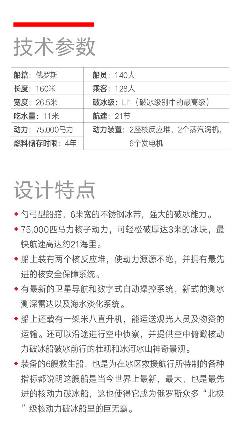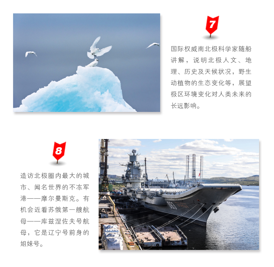 向北极航行,航行中可观赏北极特有风光,叹为观止。超级强力核子动力破冰船可以切开3米厚冰,其破冰之气势壮观,非平常可见。船上直升机待命起飞,除了担任空中侦查,协助破冰前航外,依天候状况并按航空机长指示可搭乘旅客,观赏破冰航行奇伟景象。