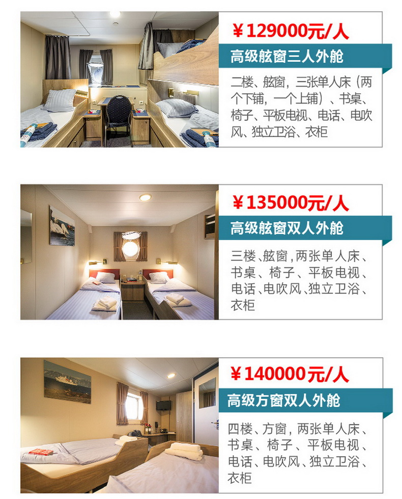 3. 北极抗冰船上三人舱1/3或双人外舱1/2舱位费;