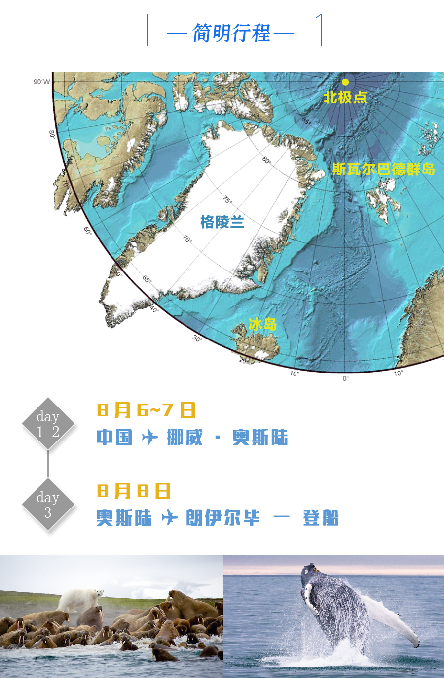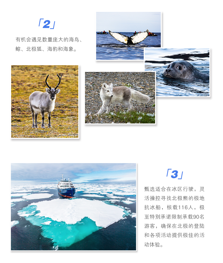 从今天起,我们的所有行程将取决于天气和冰面情况,探访无人区,穿越北纬80度,欣赏壮丽的峡湾、冰川和浮冰,寻觅北极熊,北极狐,驯鹿,海象,海燕等北极特有的野生动物。