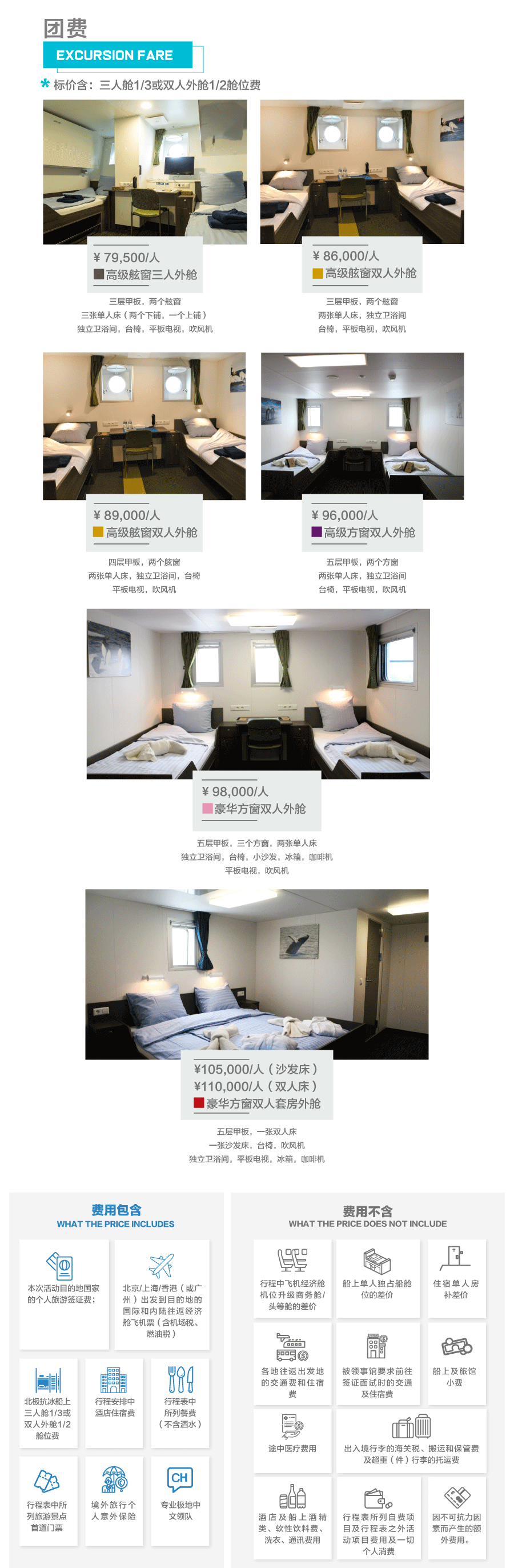 3. 北极抗冰船上三人舱1/3或双人外舱1/2舱位费;