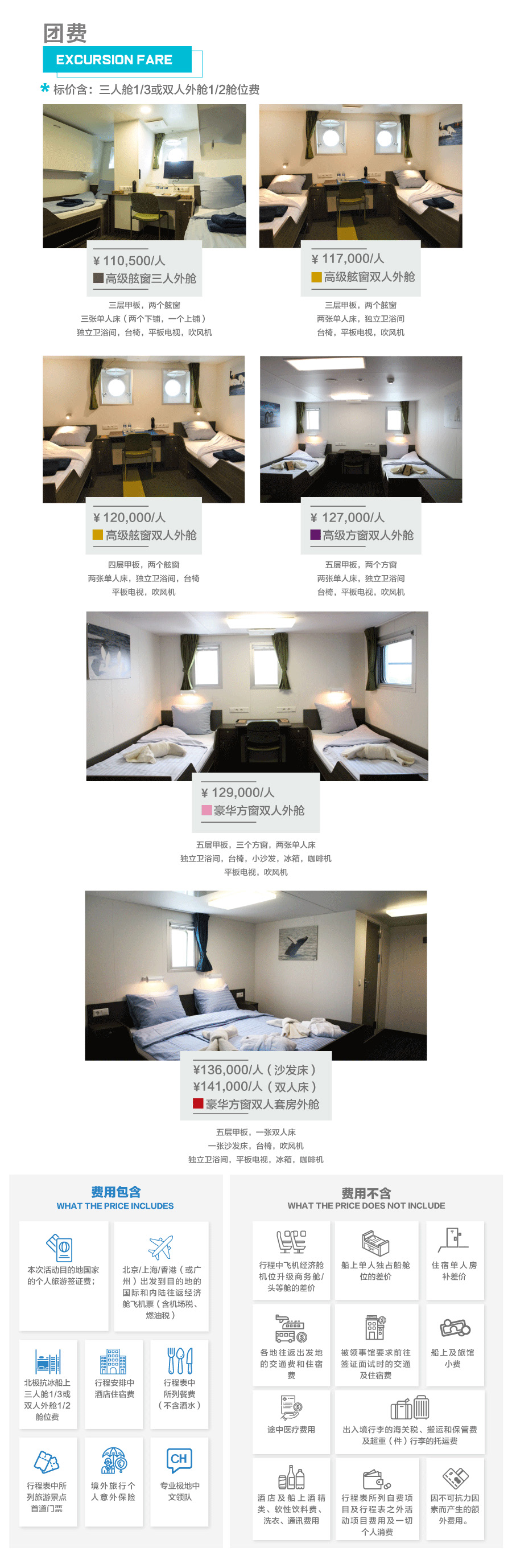 3. 北极抗冰船上三人舱1/3或双人外舱1/2舱位费;