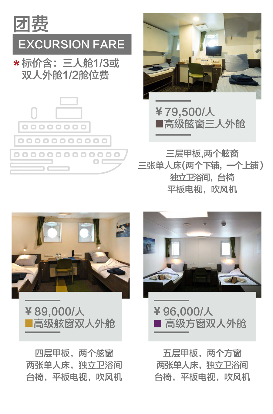 3. 北极抗冰船上三人舱1/3或双人外舱1/2舱位费;