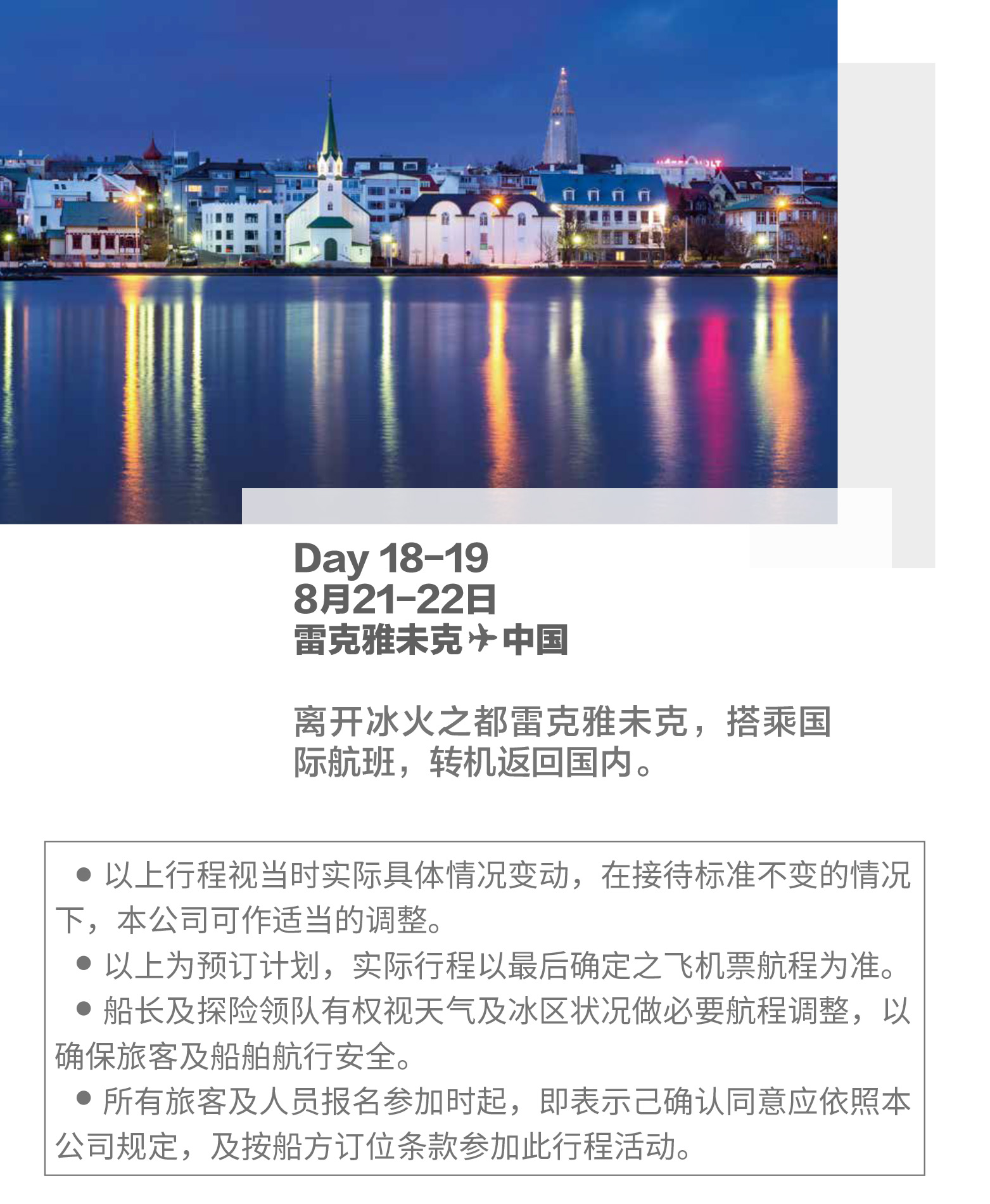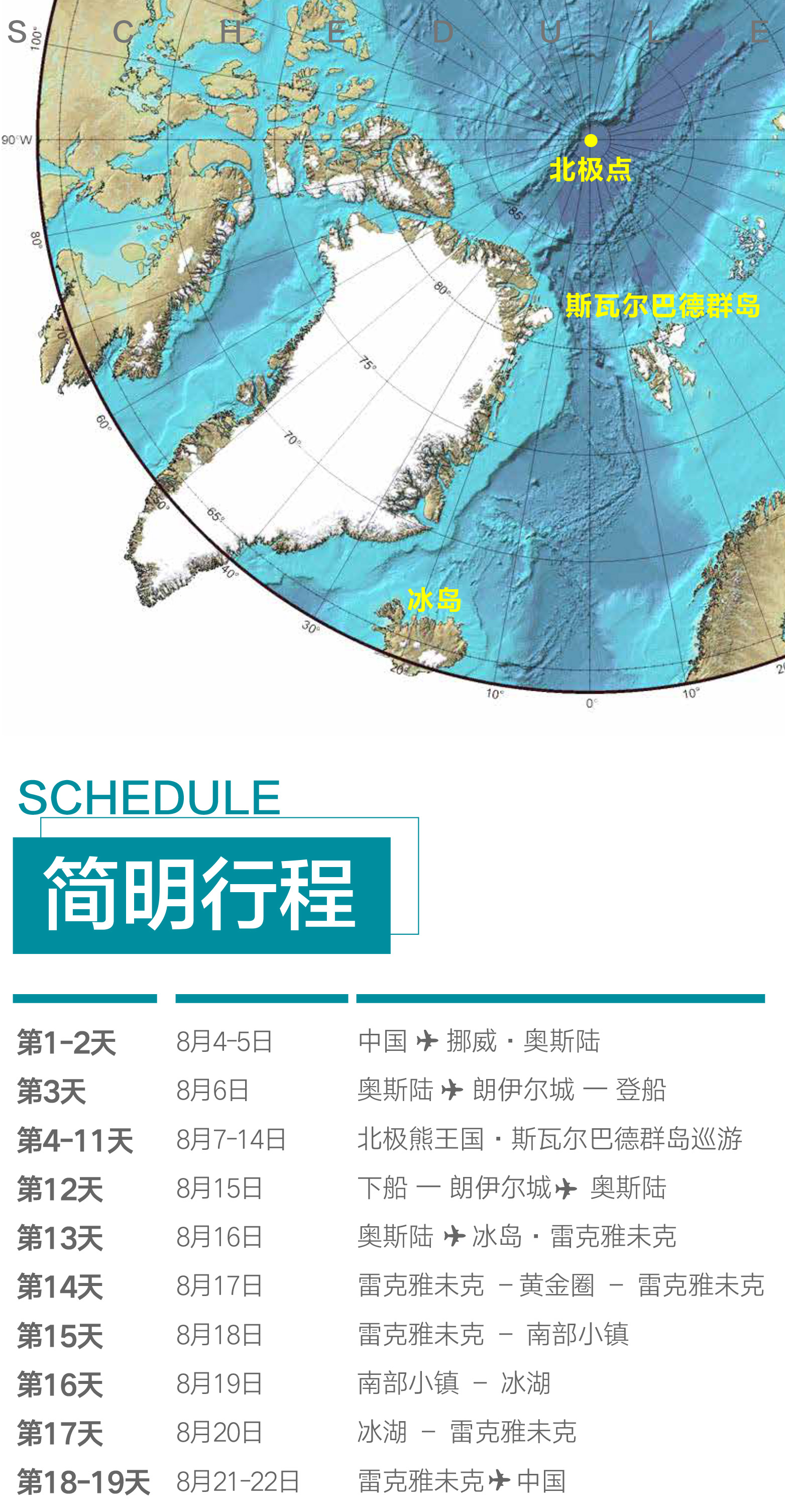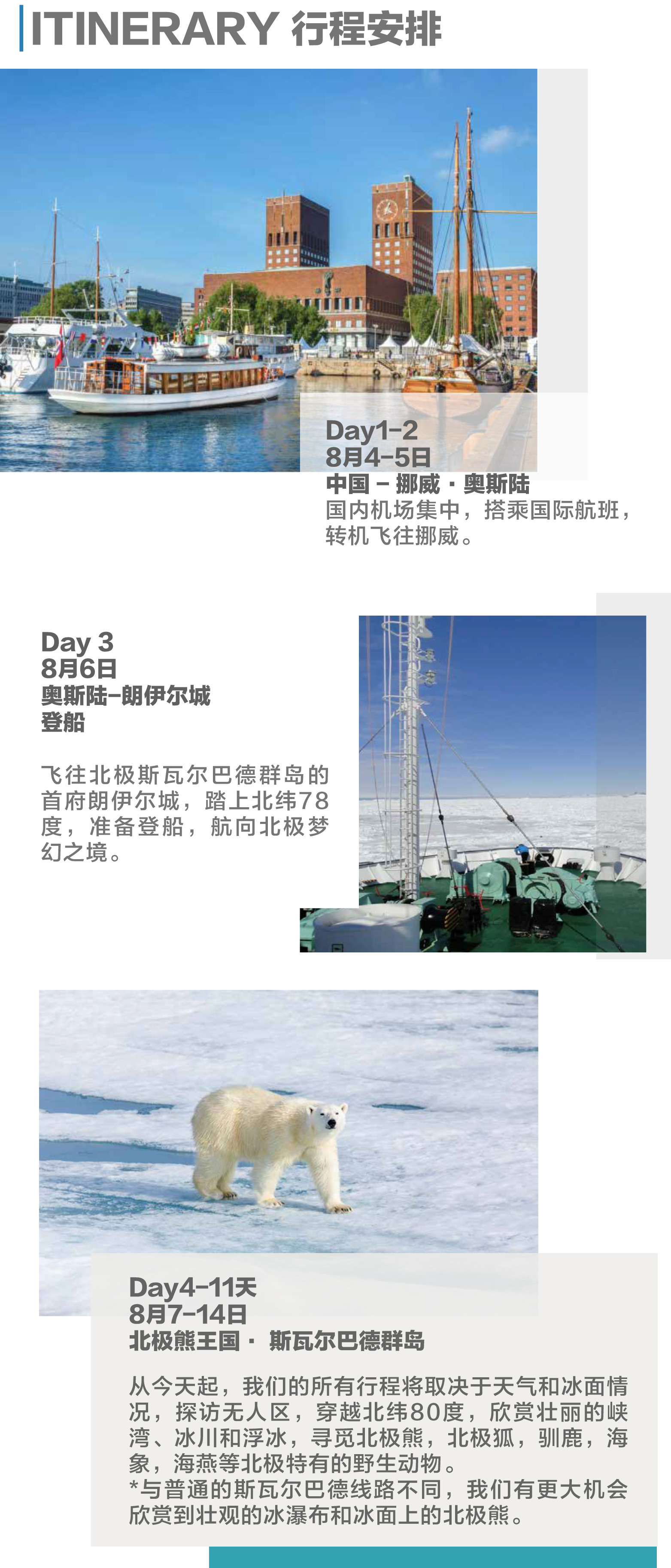 确保最大的几率近观北极熊;只限90游客最佳的活动体验;深度探访北极熊的故乡;有机会观看鲸、北极狐、海豹和海象;全面的北极风光地貌;有机会遇见数量庞大的海鸟;游览位于美亚板块交界的冰火交织的冰岛;中国唯一一家17年内28次探访北极斯瓦尔巴德群岛每次看到北极熊