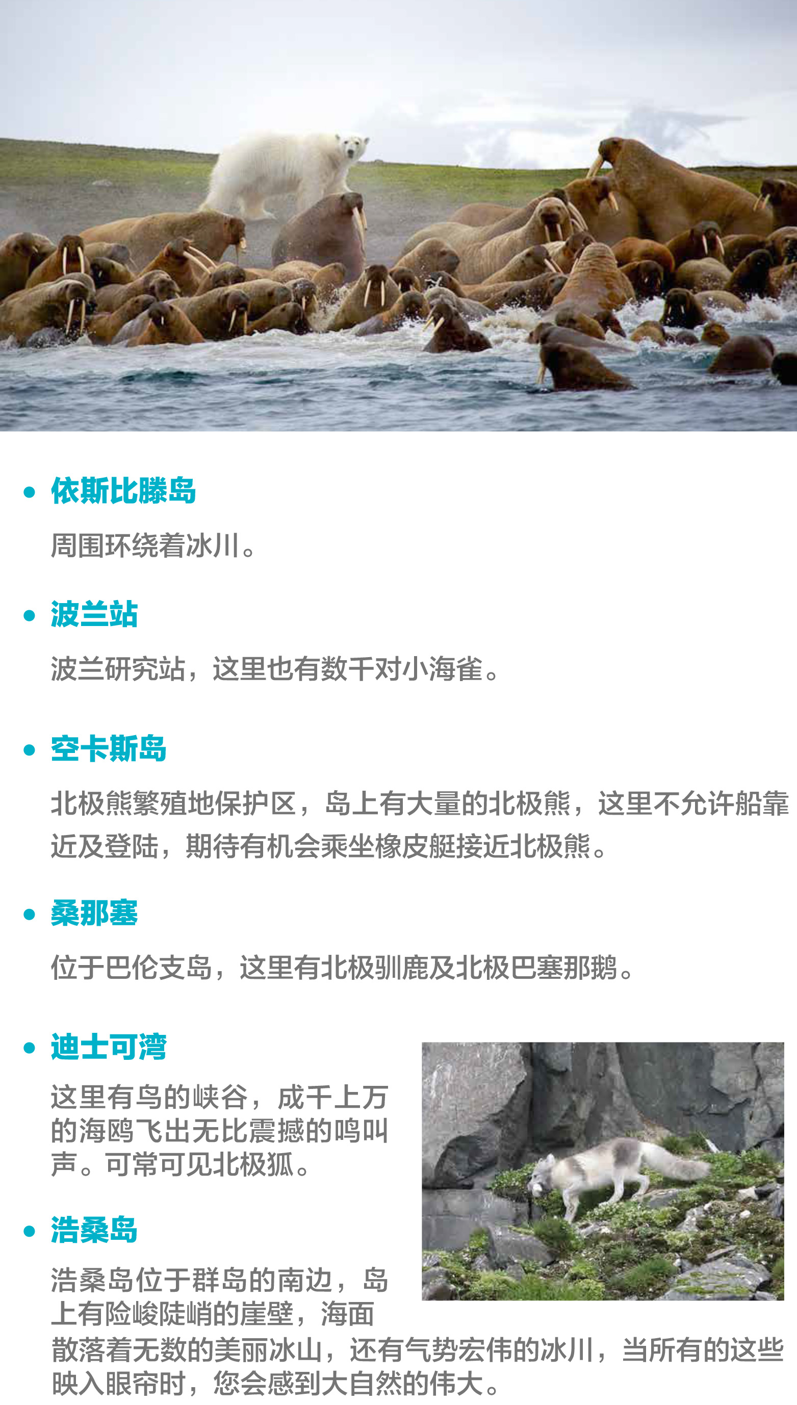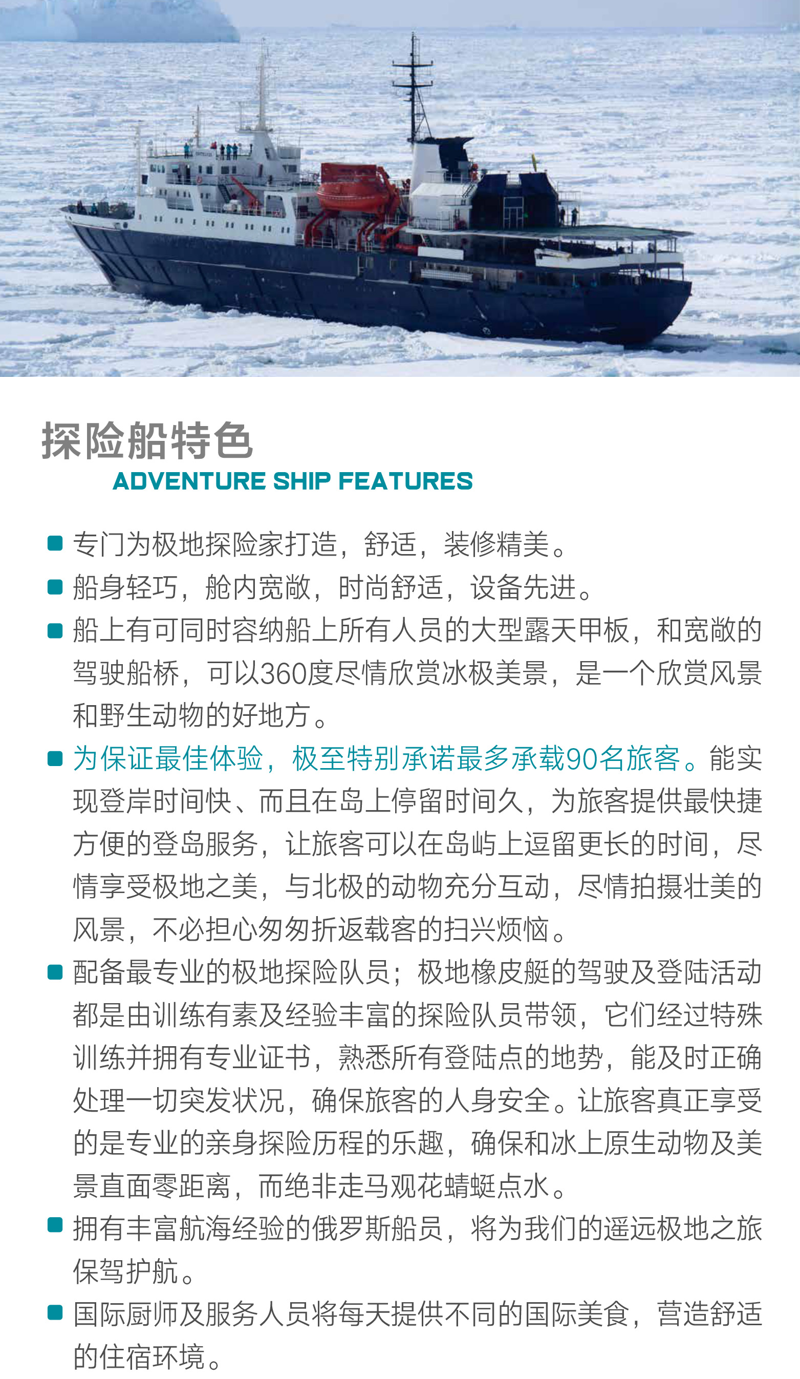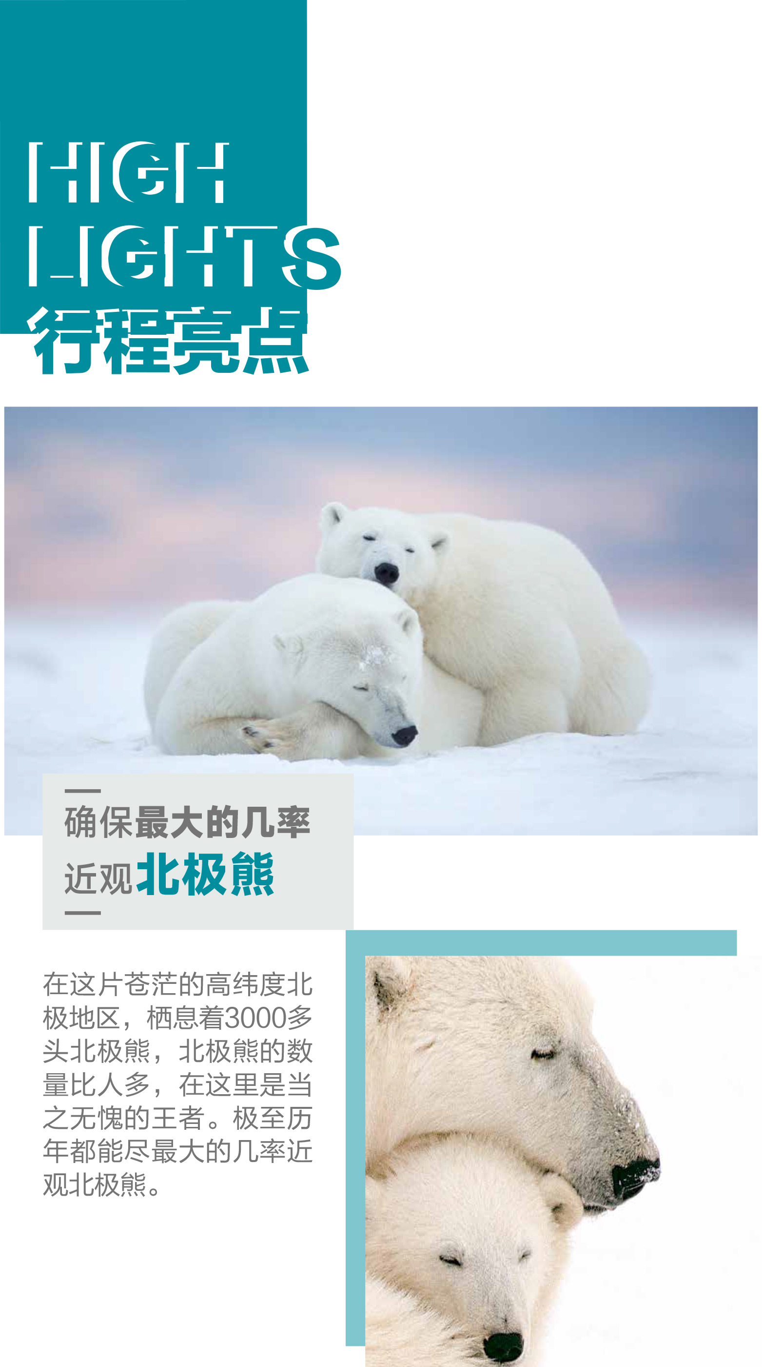 确保最大的几率近观北极熊;只限90游客最佳的活动体验;深度探访北极熊的故乡;有机会观看鲸、北极狐、海豹和海象;全面的北极风光地貌;有机会遇见数量庞大的海鸟;探访格陵兰小渔村;中国唯一一家17年内28次探访北极斯瓦尔巴德群岛每次看到北极熊