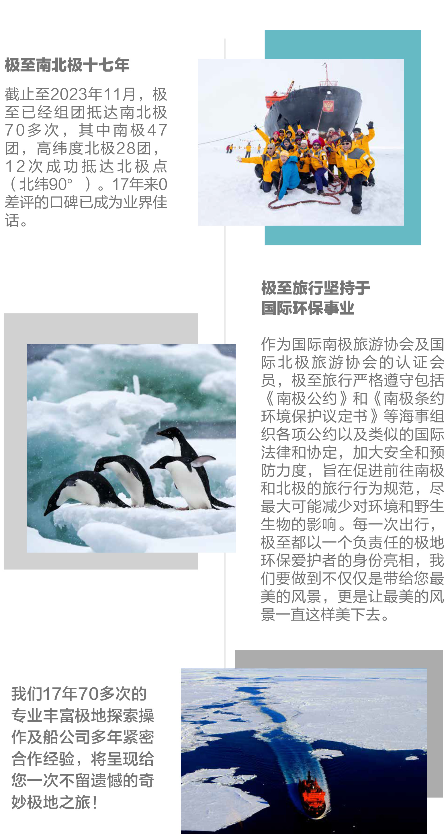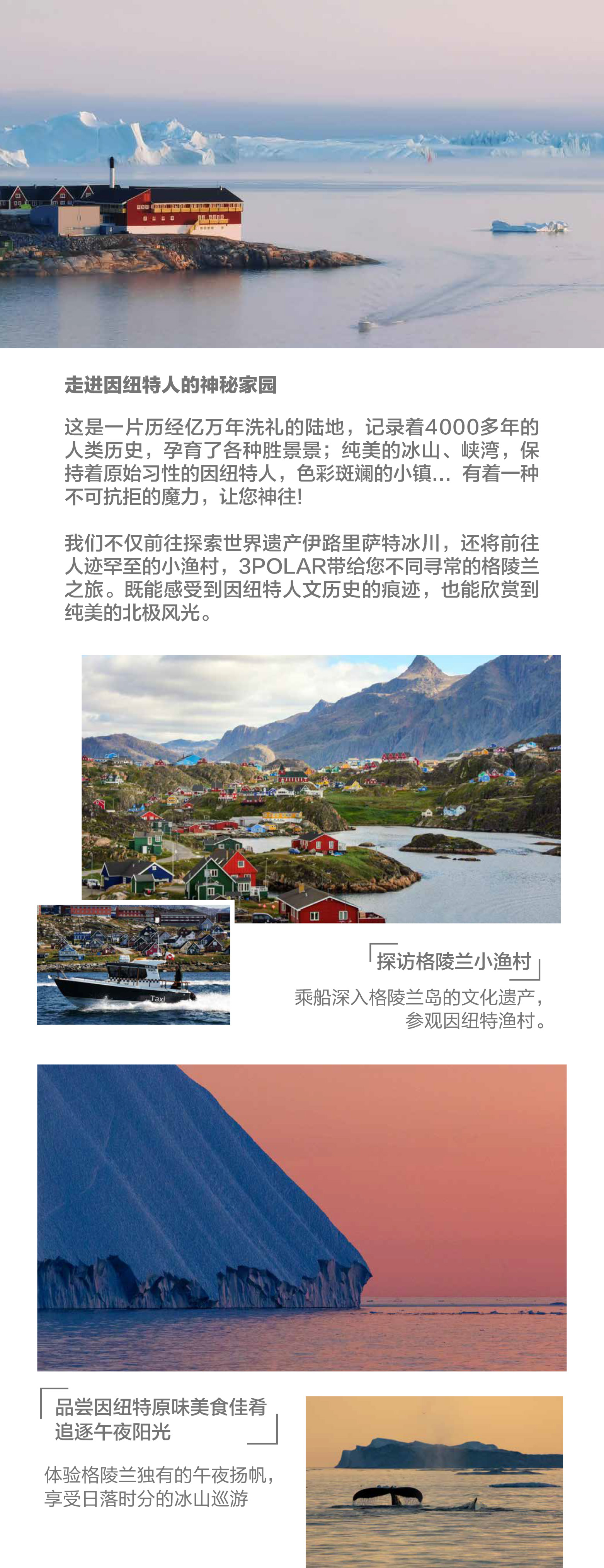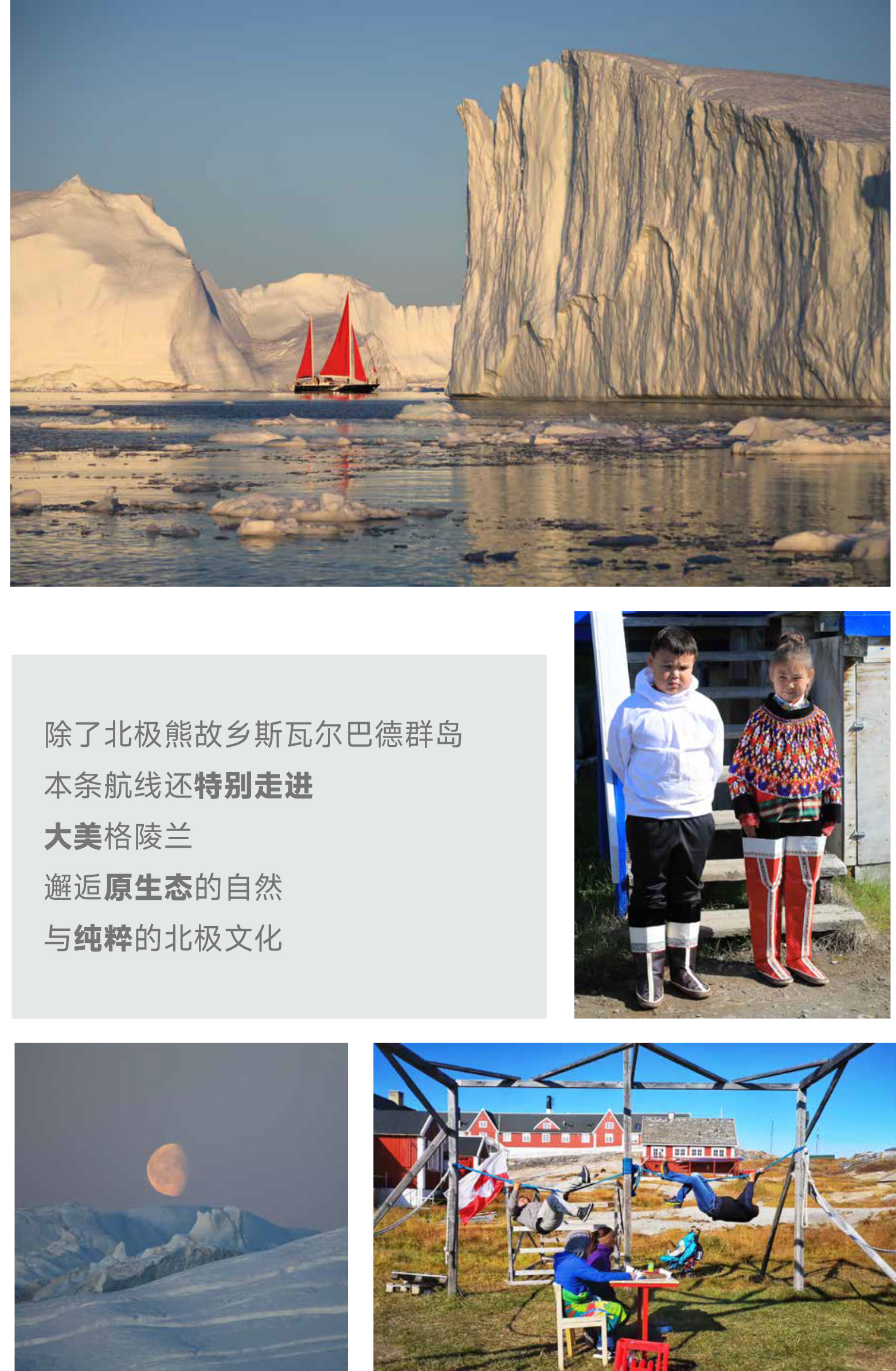 确保最大的几率近观北极熊;只限90游客最佳的活动体验;深度探访北极熊的故乡;有机会观看鲸、北极狐、海豹和海象;全面的北极风光地貌;有机会遇见数量庞大的海鸟;探访格陵兰小渔村;中国唯一一家17年内28次探访北极斯瓦尔巴德群岛每次看到北极熊