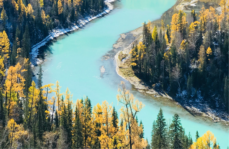 山水之间的喀纳斯是北疆人气最旺的景点,“湖怪”传闻令它一举成名。不过光看看喀纳斯湖水的颜色已经足以让你震撼。湖水会在不同季节呈现碧蓝、青灰、翡翠、墨绿、奶绿等不同色彩。进入9月后,金色的桦树叶、杏黄的落叶松、火红的欧洲山杨、四季常青的松柏排排站,是童话世界没错了。