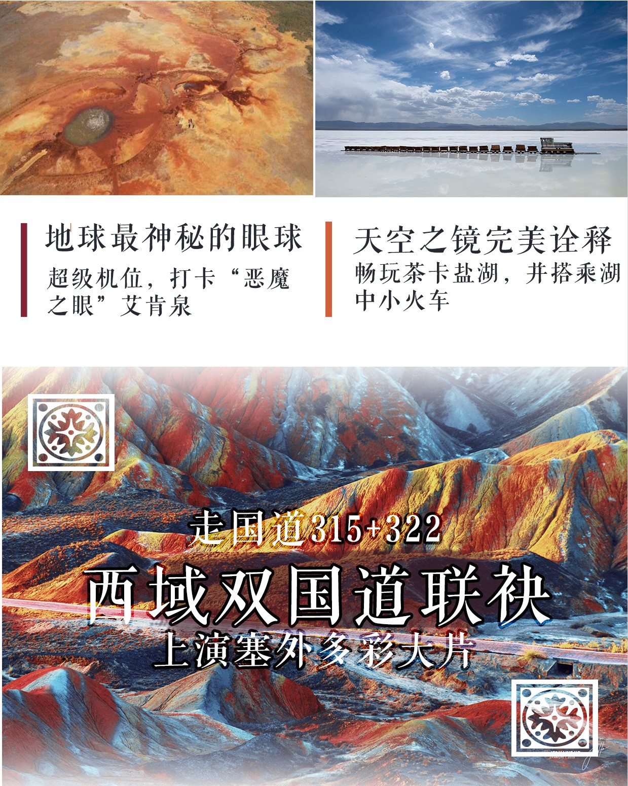 【茶卡盐湖】茶卡盐湖是柴达木盆地有名的天然结晶盐湖,中国的“天空之镜”,盐产量可供全国人民使用约75年。景区里有众多的盐雕可以观赏,还可以乘坐小火车,到盐湖的深处观光。游客可以赤脚走到湖面上观看和拍摄自己的倒影,如果足够幸运,白天可以看到在这些河面上形成的海市蜃楼。
