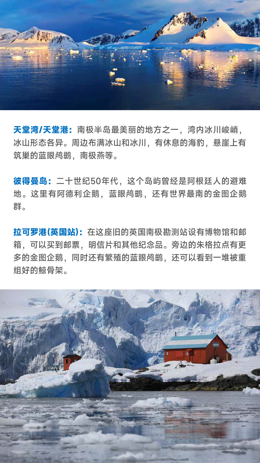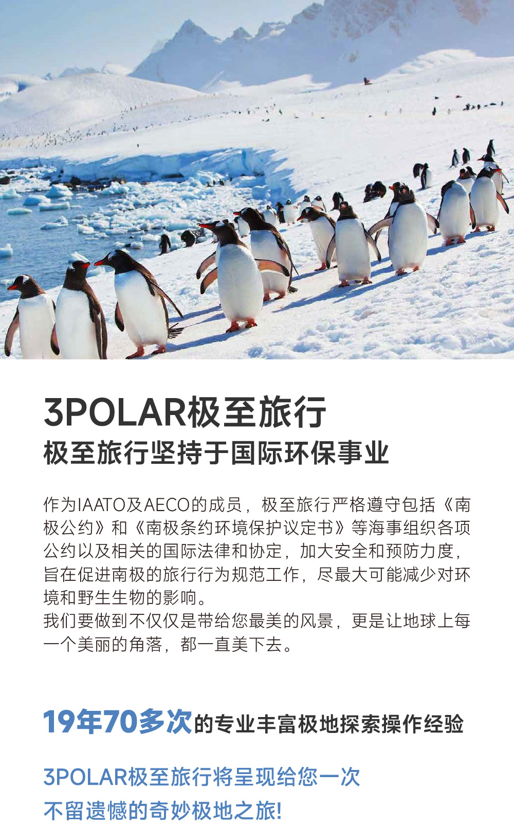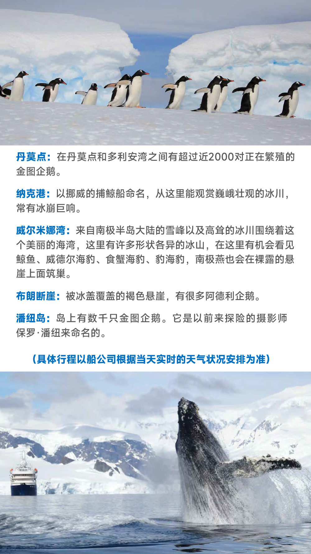 重要提示: 我们有义务告知您,在南极地区的所有活动都可能会受到天气变化的影响,船方不会进行任何有可能损害旅行者和工作人员安全的独特旅行体验的行动。