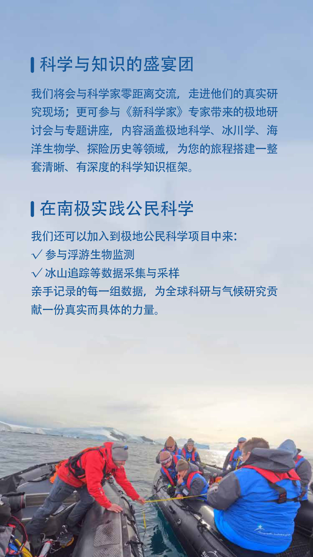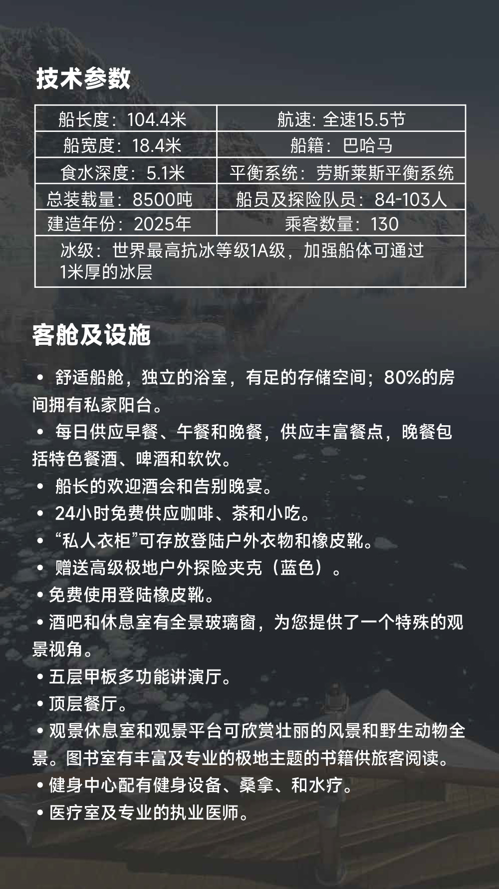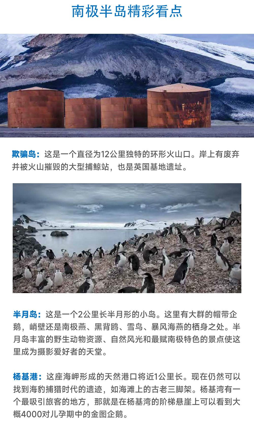 重要提示: 我们有义务告知您,在南极地区的所有活动都可能会受到天气变化的影响,船方不会进行任何有可能损害旅行者和工作人员安全的独特旅行体验的行动。