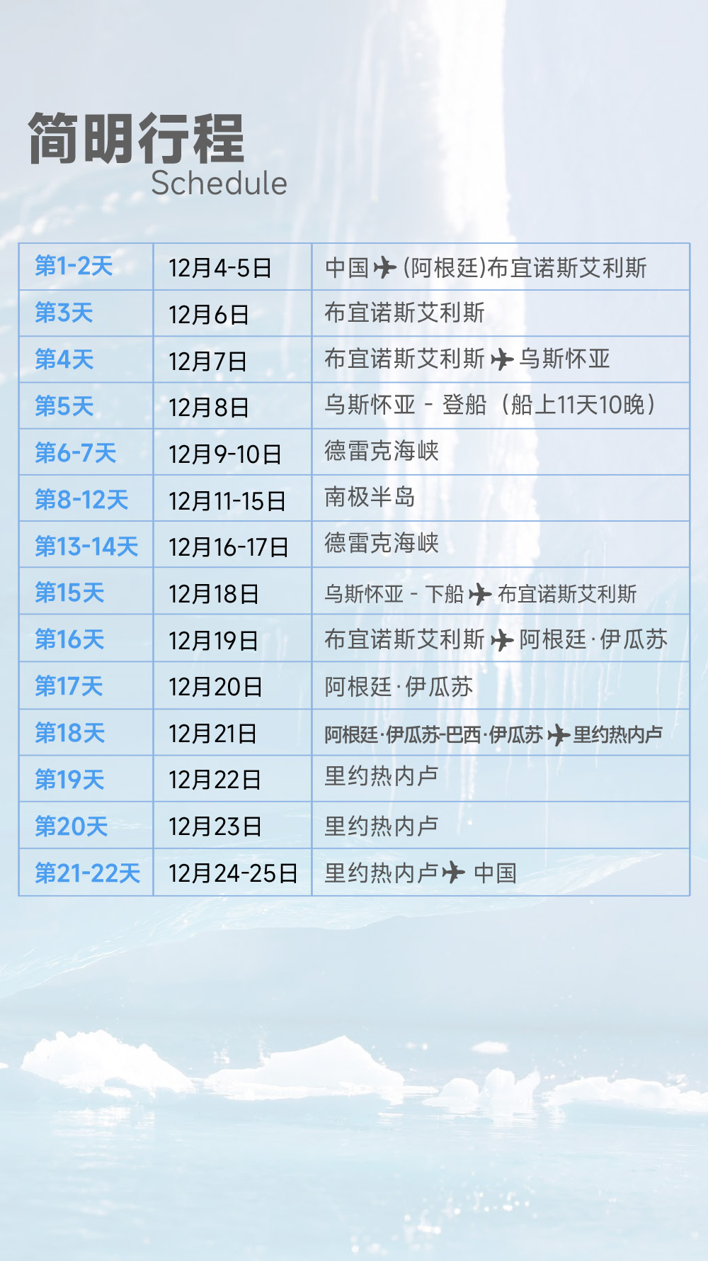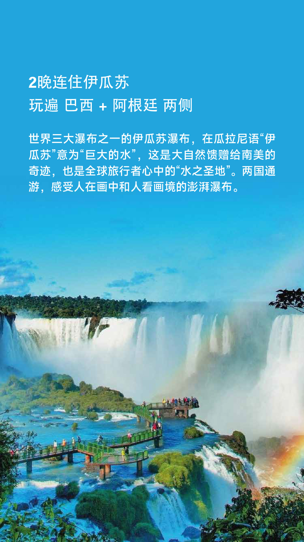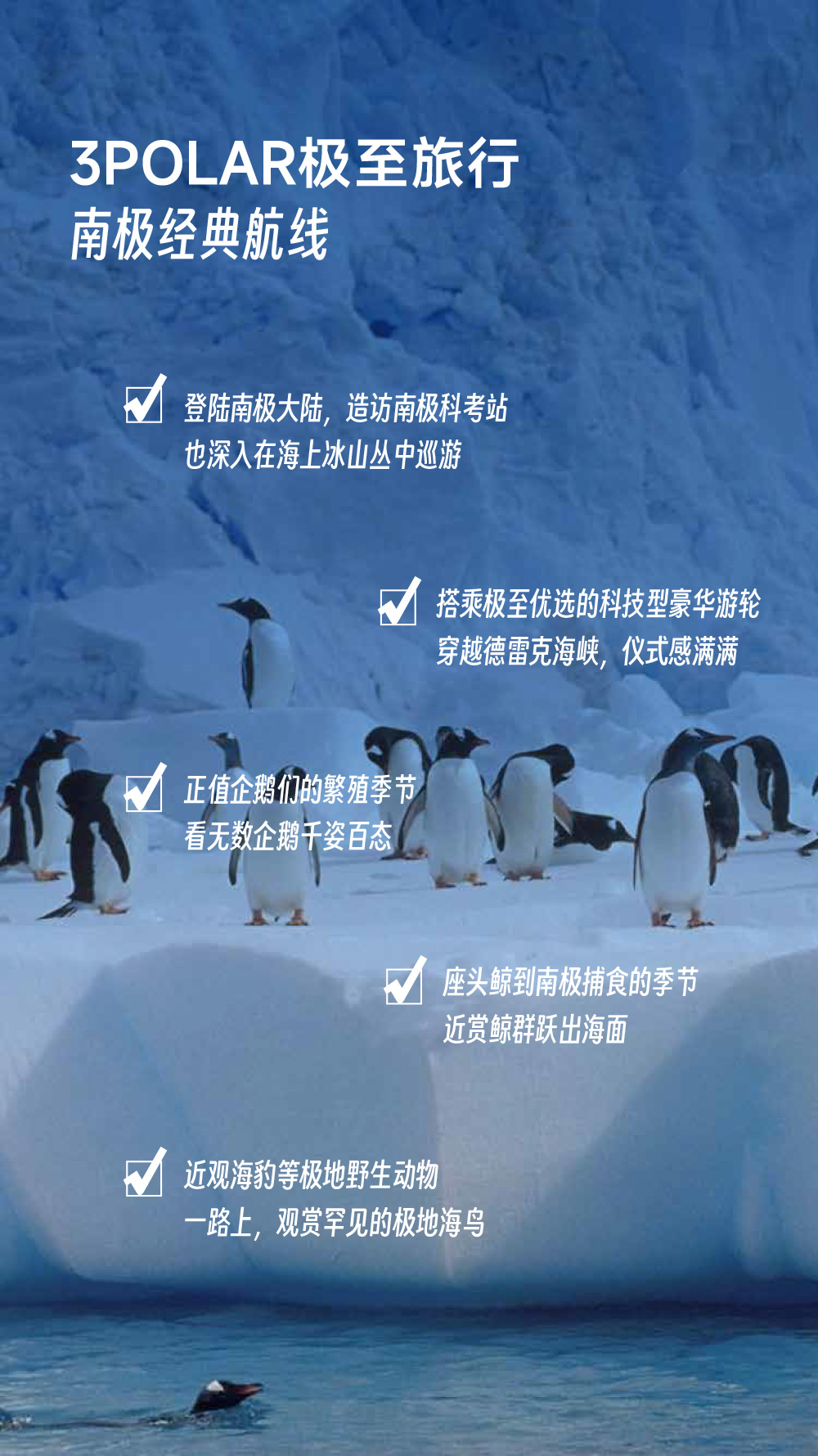 南极船上11天10晚 登陆活动时间长达五天;2晚连住伊瓜苏 玩遍 巴西 + 阿根廷两侧;登陆南极大陆,造访南极科考站,也深入在海上冰山丛中巡游;搭乘极至优选的科技型豪华游轮,穿越德雷克海峡,仪式感满满;正值企鹅们的繁殖季节,看无数企鹅千姿百态;座头鲸到南极捕食的季节,近赏鲸群跃出海面;近观海豹等极地野生动物,一路上,观赏罕见的极地海鸟