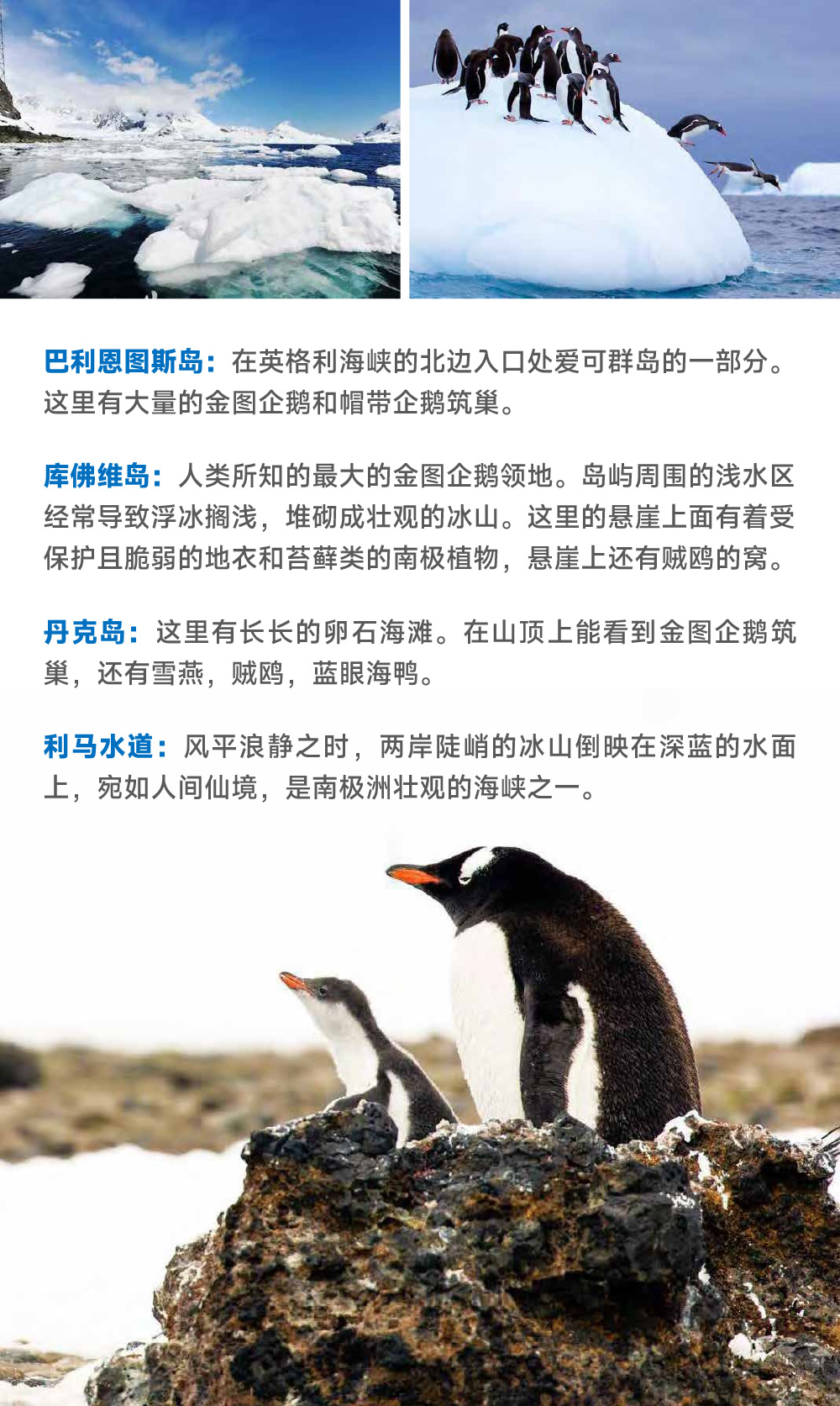 我们将有机会登陆南极大陆这个最美的白色星球,步行到企鹅点缀的海滩,攀上雪山顶鸟瞰南极的纯净壮美,在企鹅的栖息地与它们近距离亲密互动,乘坐橡皮艇在冰山群中穿梭巡游,还将看到鲸鱼和海豹成群游玩。