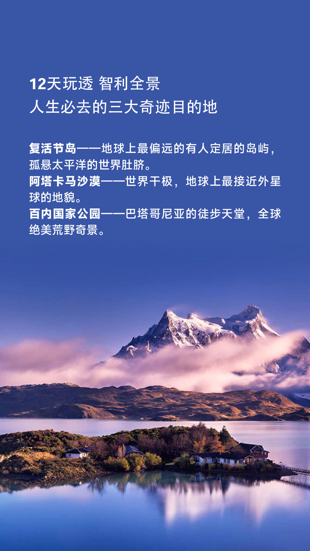 南极船上11天10晚 登陆活动时间长达五天;登陆南极大陆,造访南极科考站,也深入在海上冰山丛中巡游;搭乘极至优选的科技型豪华游轮,穿越德雷克海峡,仪式感满满;正值企鹅们的繁殖季节,看无数企鹅千姿百态;座头鲸到南极捕食的季节,近赏鲸群跃出海面;近观海豹等极地野生动物,一路上,观赏罕见的极地海鸟;12天玩透 智利全景