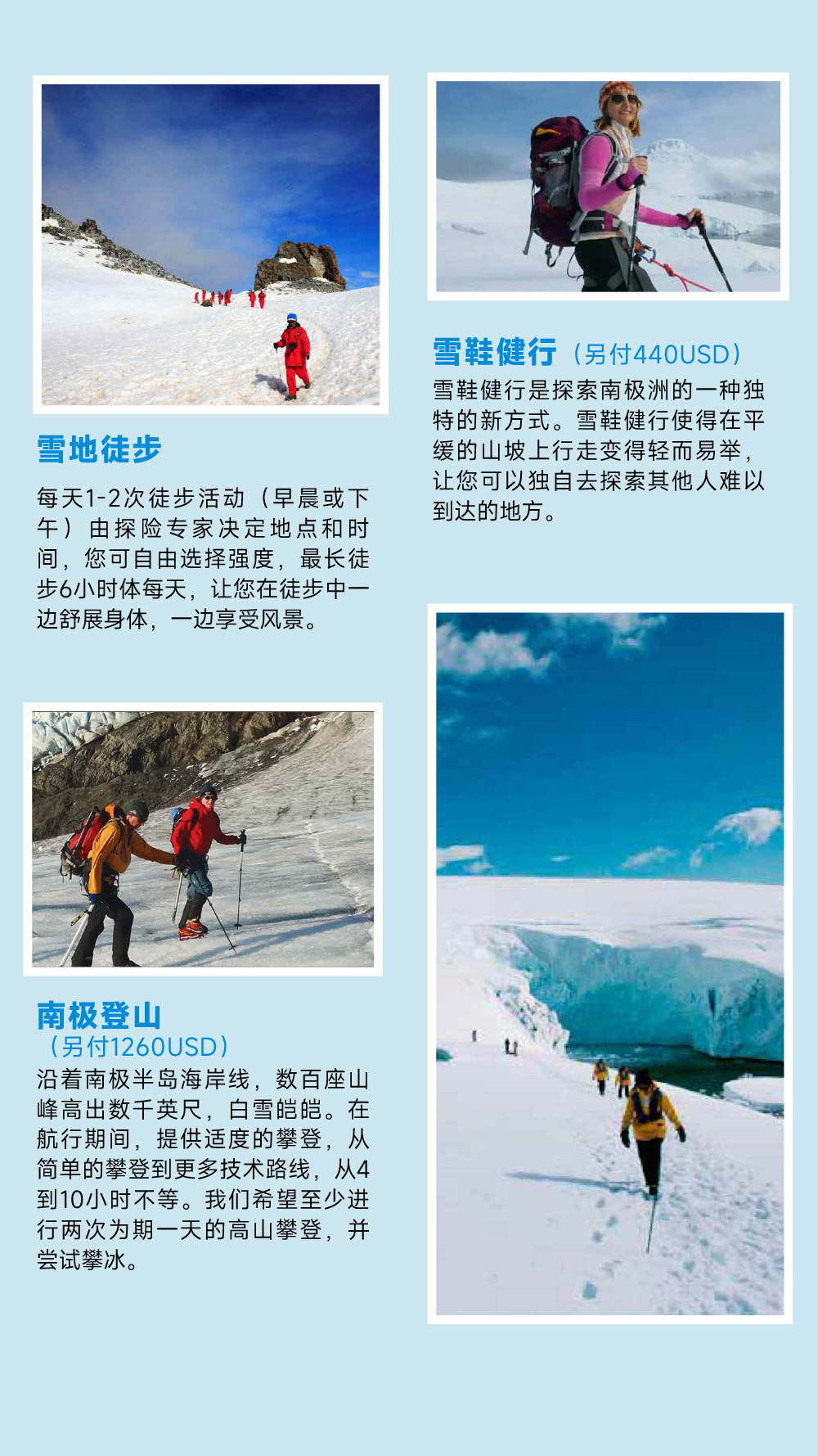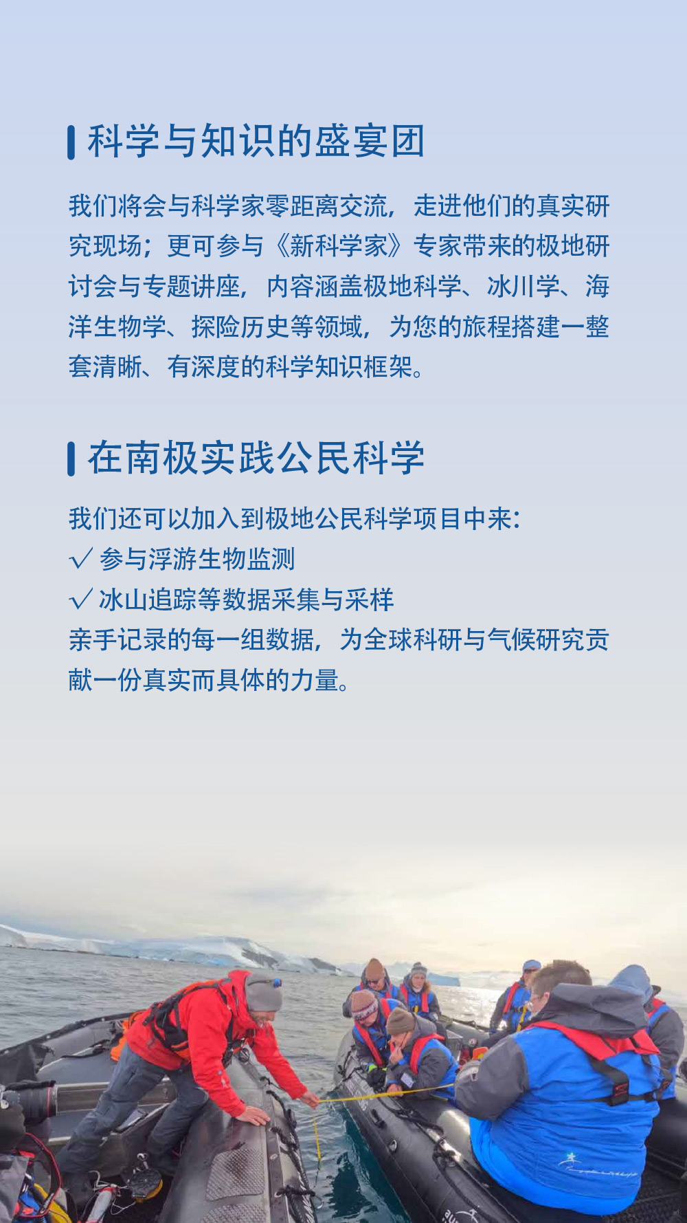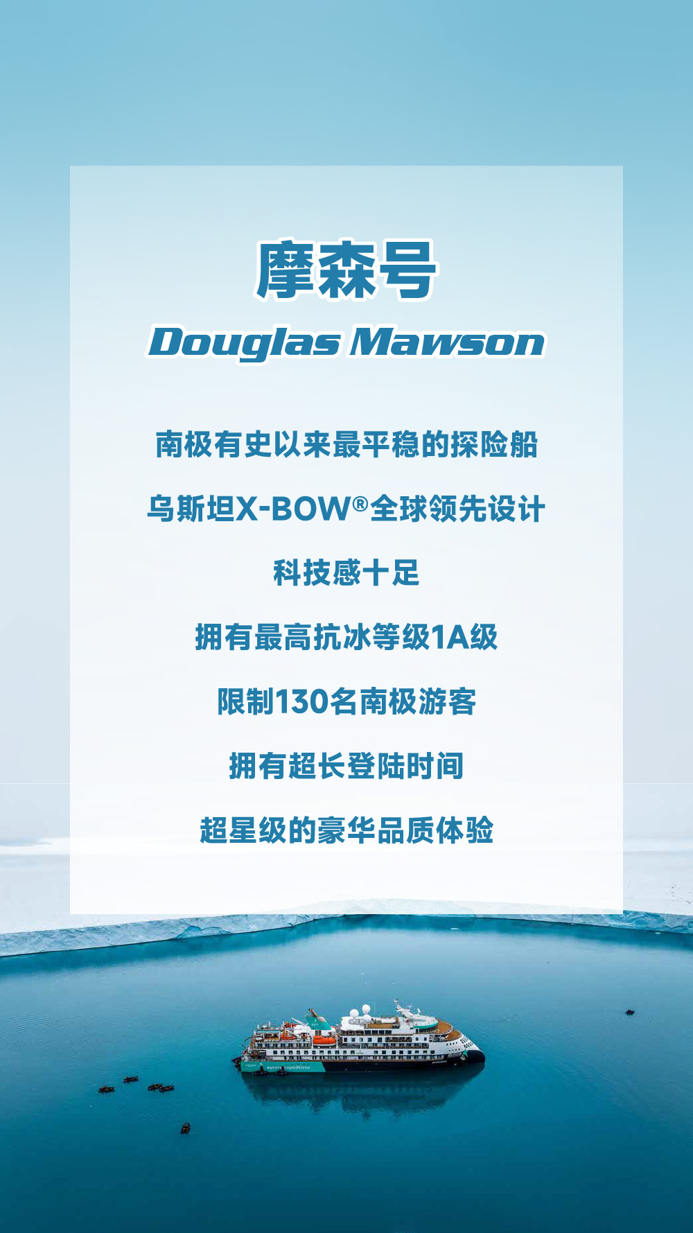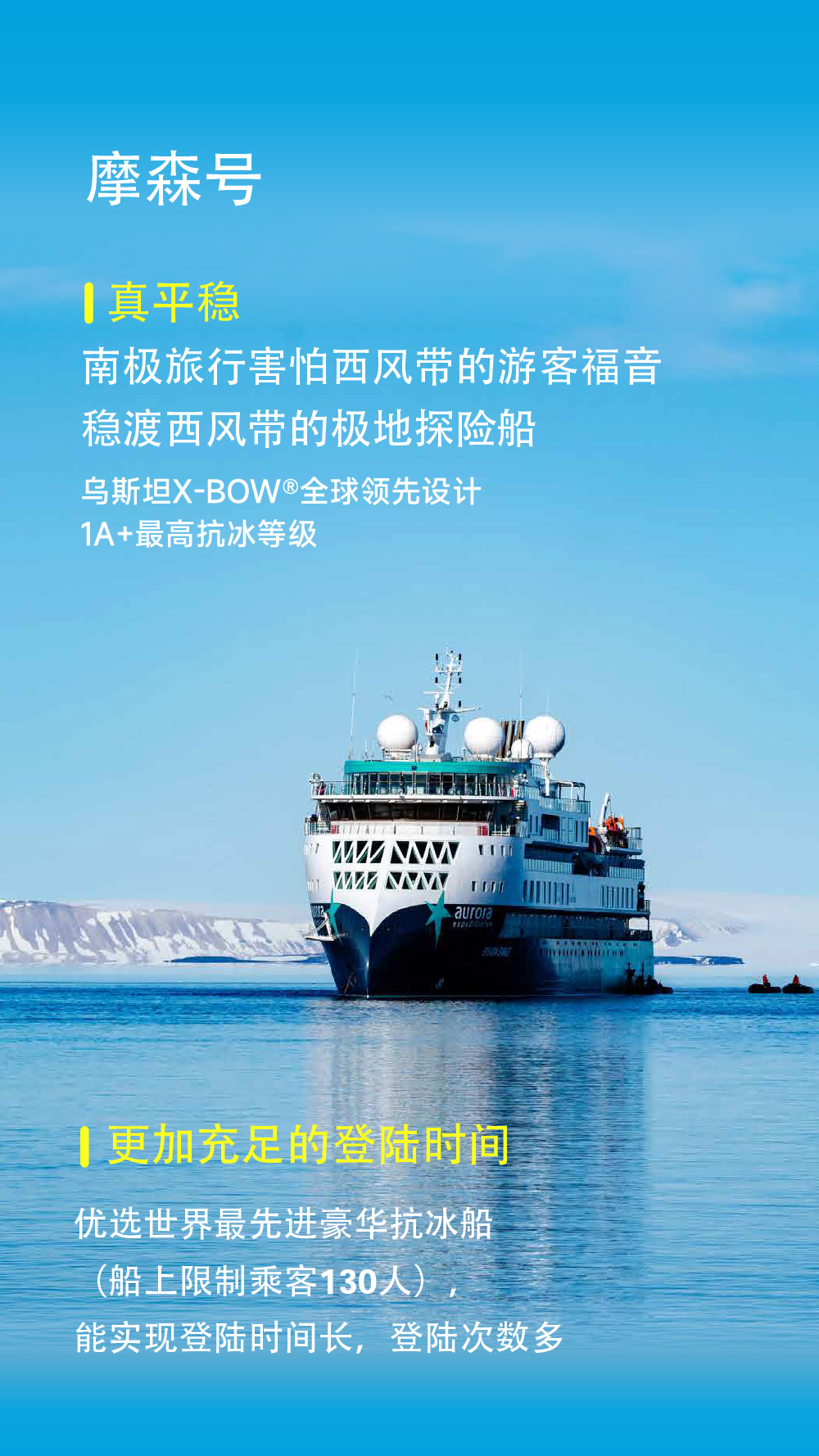 重要提示: 我们有义务告知您,在南极地区的所有活动都可能会受到天气变化的影响,船方不会进行任何有可能损害旅行者和工作人员安全的独特旅行体验的行动。