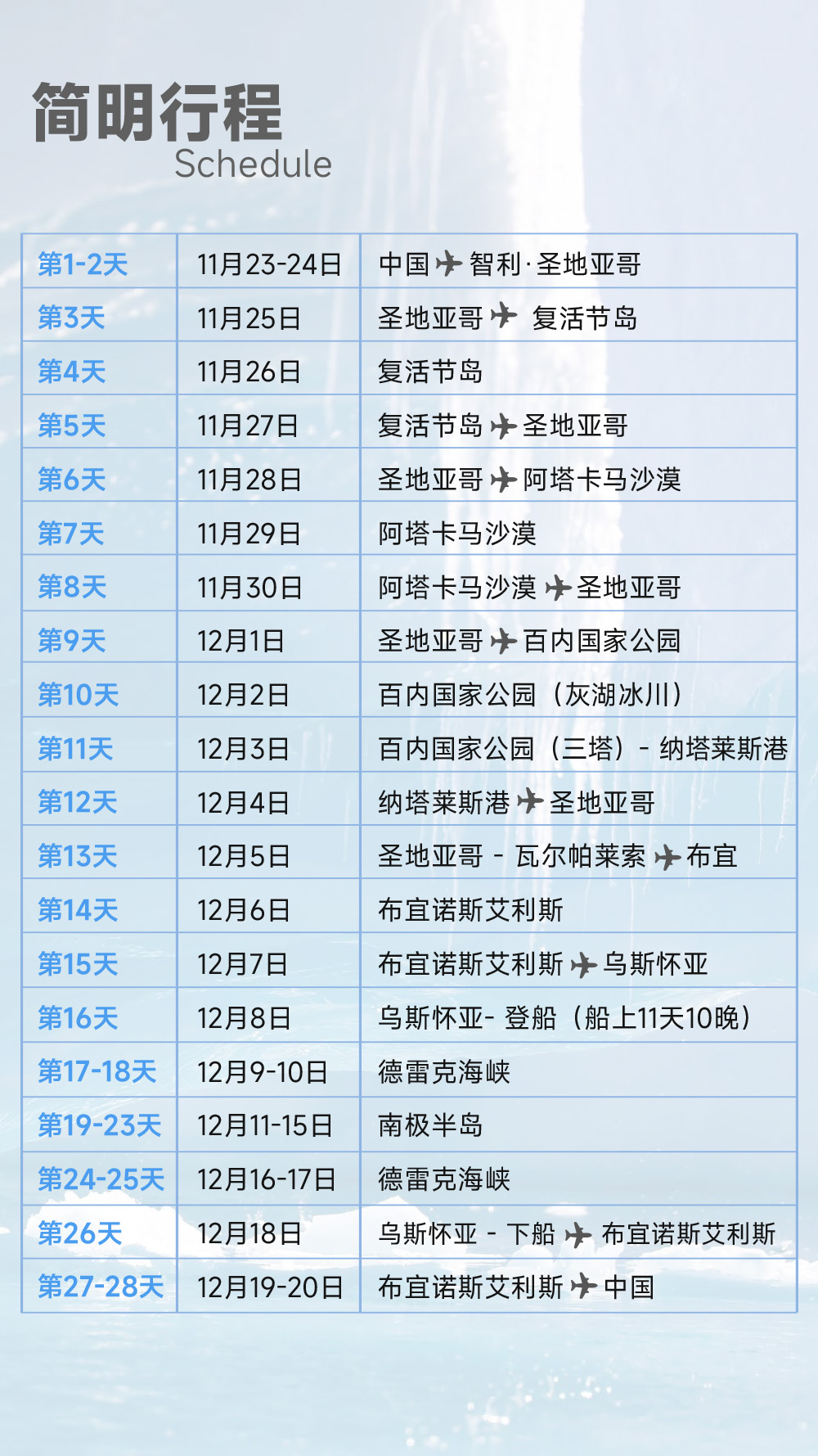 早上抵达乌斯怀亚,飞返首都布宜诺斯艾利斯。晚上前往国际机场乘机飞返中国。