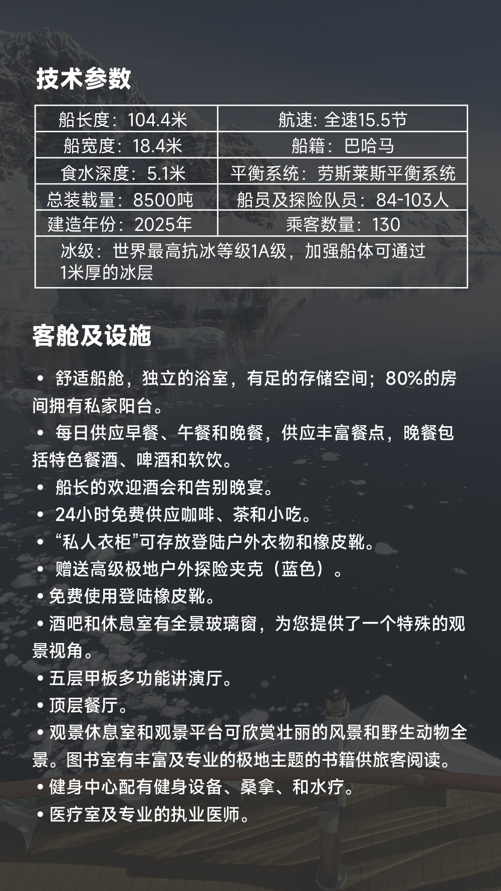 3. 南极抗冰船双人间的1/2舱位;