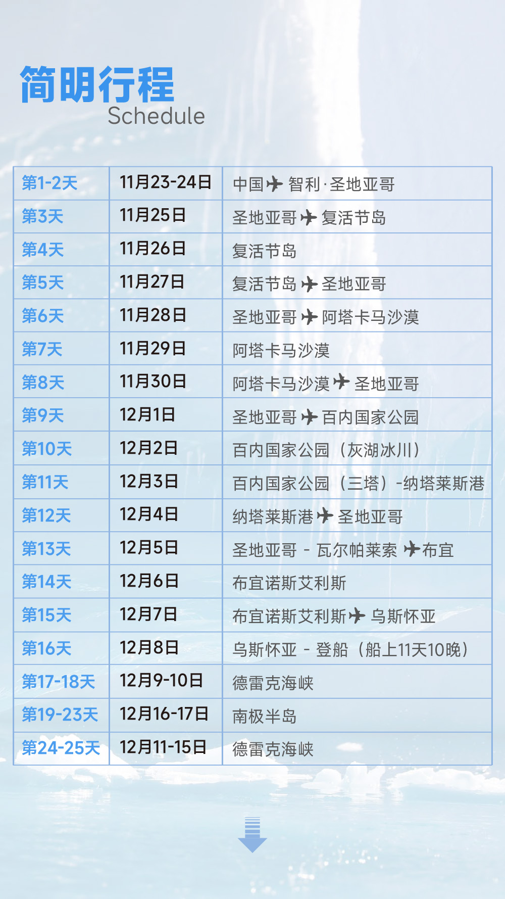 南极船上11天10晚 登陆活动时间长达五天;12天玩透 智利全景;2晚连住伊瓜苏 玩遍 巴西 + 阿根廷两侧;登陆南极大陆,造访南极科考站,也深入在海上冰山丛中巡游;搭乘极至优选的科技型豪华游轮,穿越德雷克海峡,仪式感满满;正值企鹅们的繁殖季节,看无数企鹅千姿百态;座头鲸到南极捕食的季节,近赏鲸群跃出海面;近观海豹等极地野生动物,一路上,观赏罕见的极地海鸟