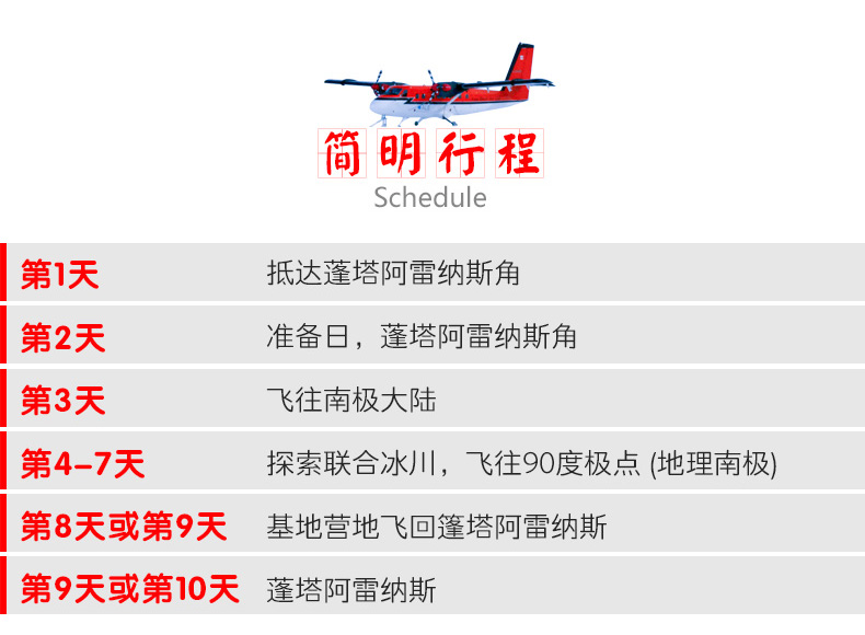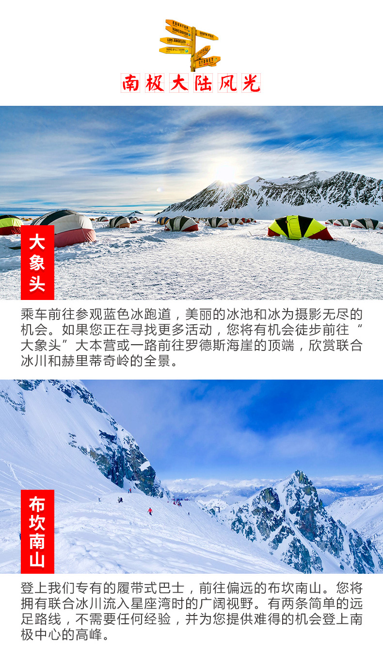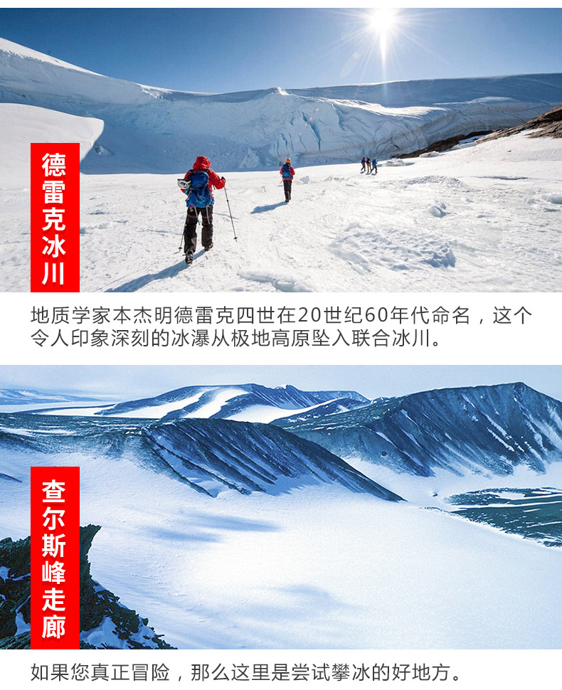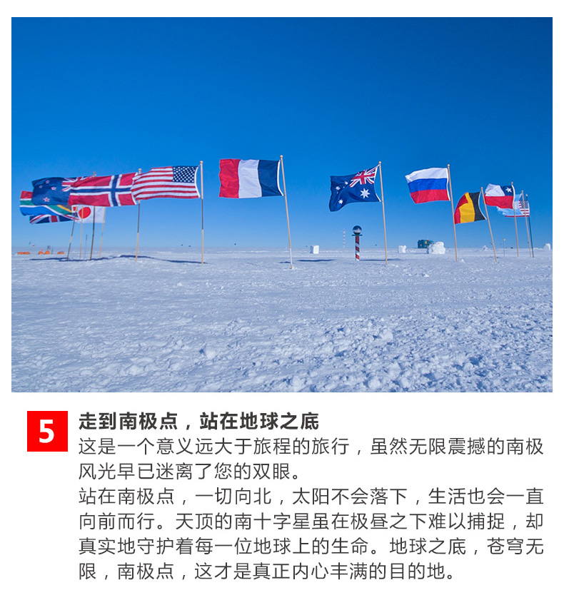 直抵地球之底的震撼体验/军民两用飞机全速直飞/在南极点和帝企鹅为伴/感慨南极大陆最神秘又温柔的一面/丰富多彩的极地活动/