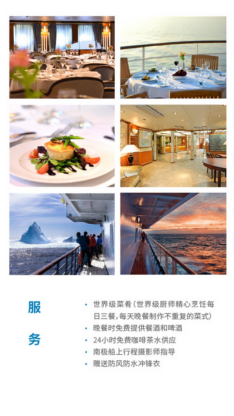 9. 船公司安排的登陆活动以及讲座及简介会,赠送专业探险冲锋衣,免费租用防水靴;