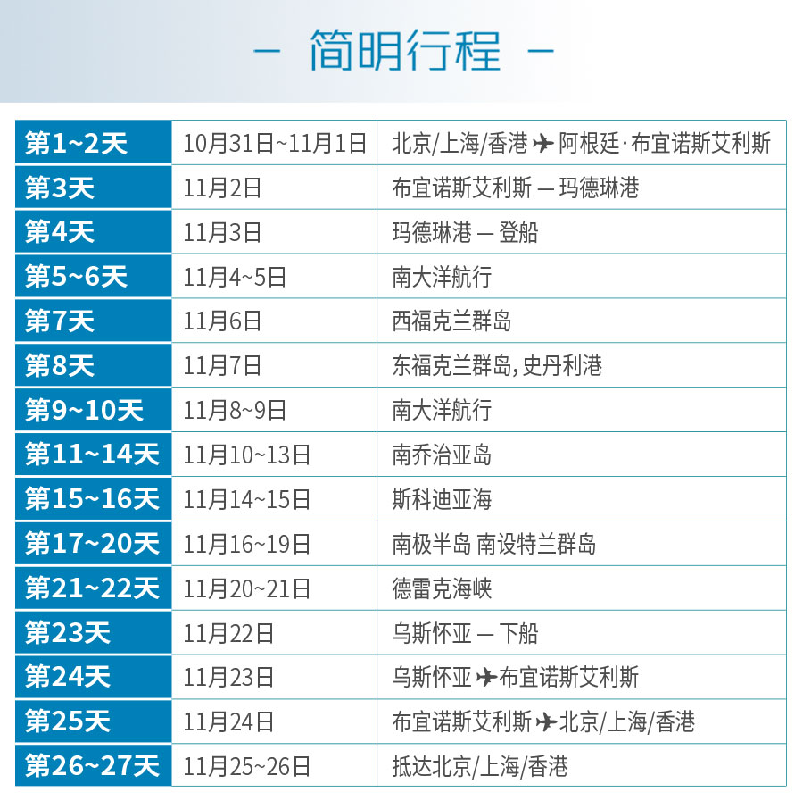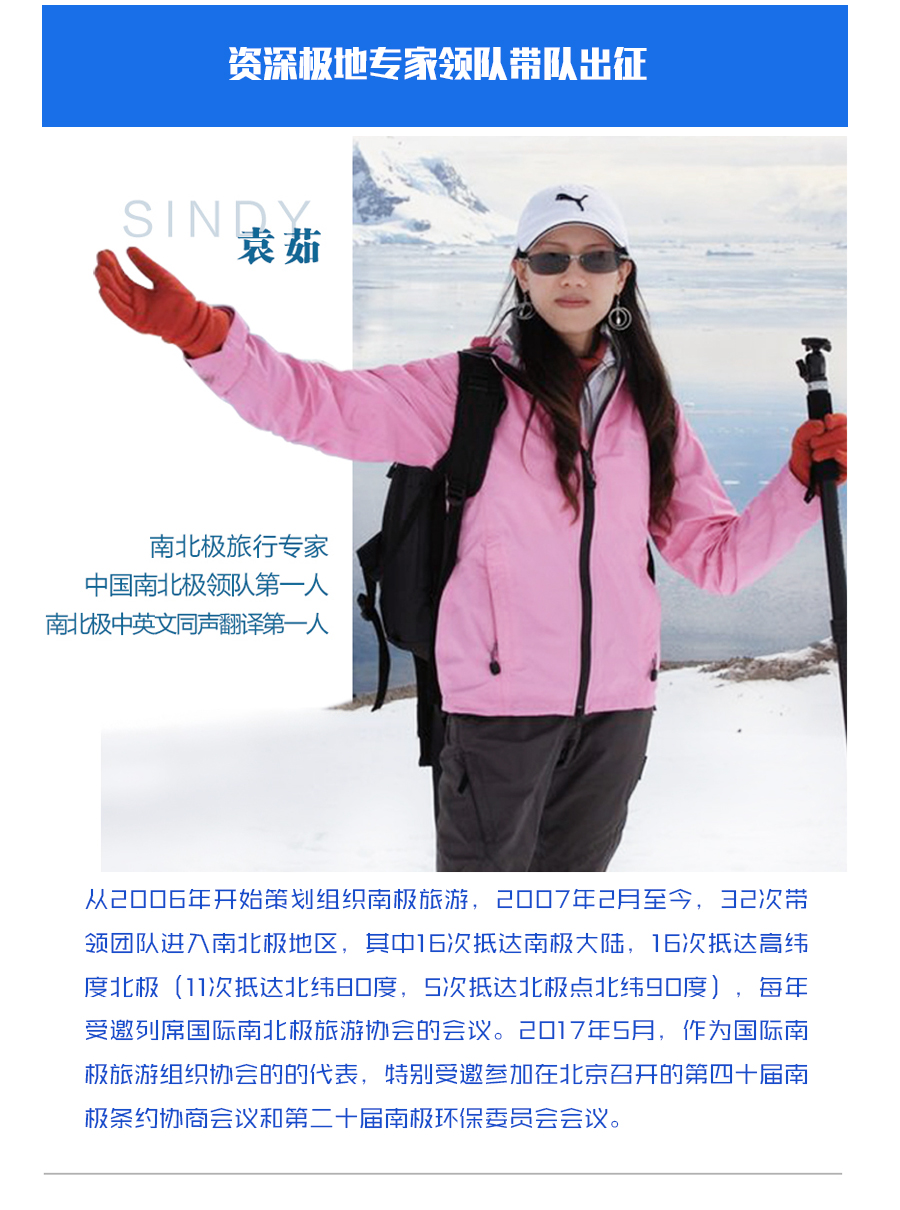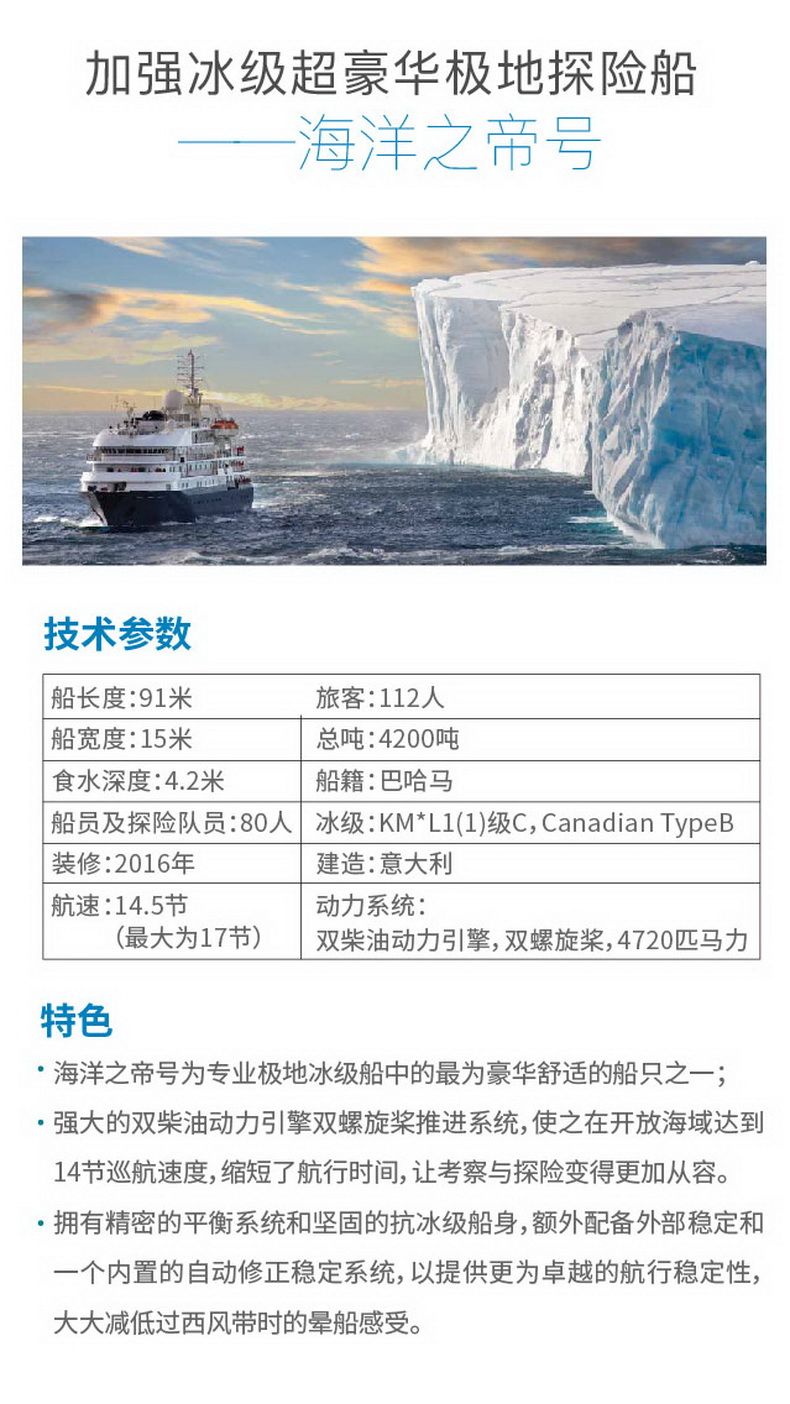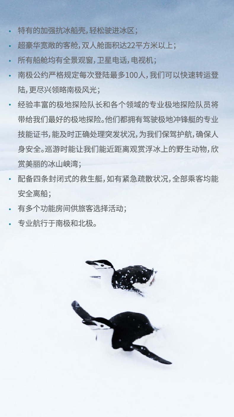 南极洲是地球上最后的净土,雄伟的雪山、幽蓝的冰山、冰封的大地、蔚蓝的海洋,这里的一切都是如此的纯净、美丽。船长和探险队长将会根据当天实时的天气、风、海浪及冰冻情况,选择极地探险项目和在南极地区航行的路线;您不但可以在甲板上感受南极的魅力,还可以乘坐橡皮艇巡游和上岸,零距离接触南极,欣赏壮丽景色的同时,还能观赏各种可爱有趣的极地生物。