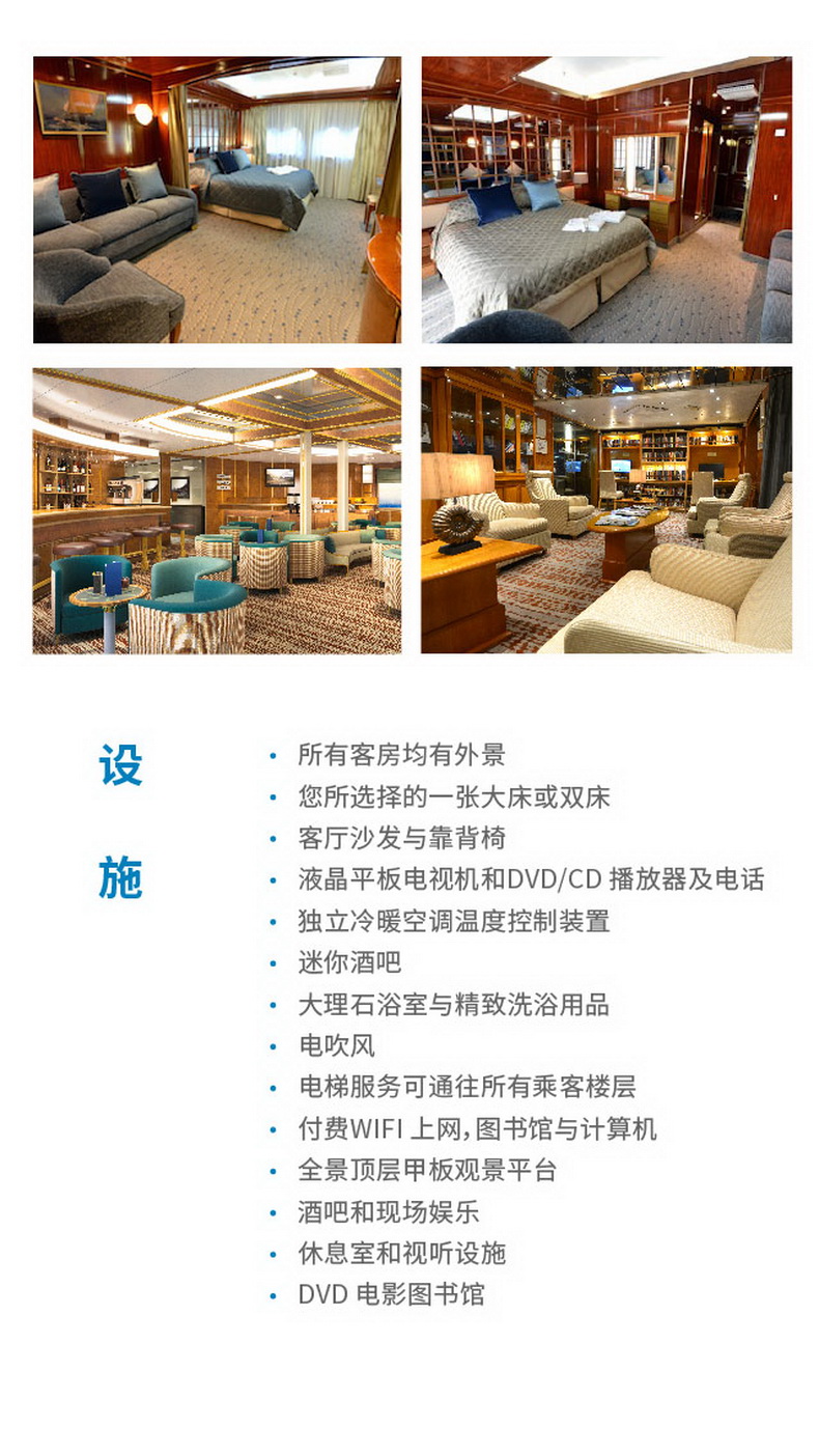 8. 行程中所列用餐(中式、西式、特色餐及船上用餐),船上晚餐提供免费葡萄酒和啤酒,船上欢迎及欢送酒会,船上24小时供应咖啡茶;