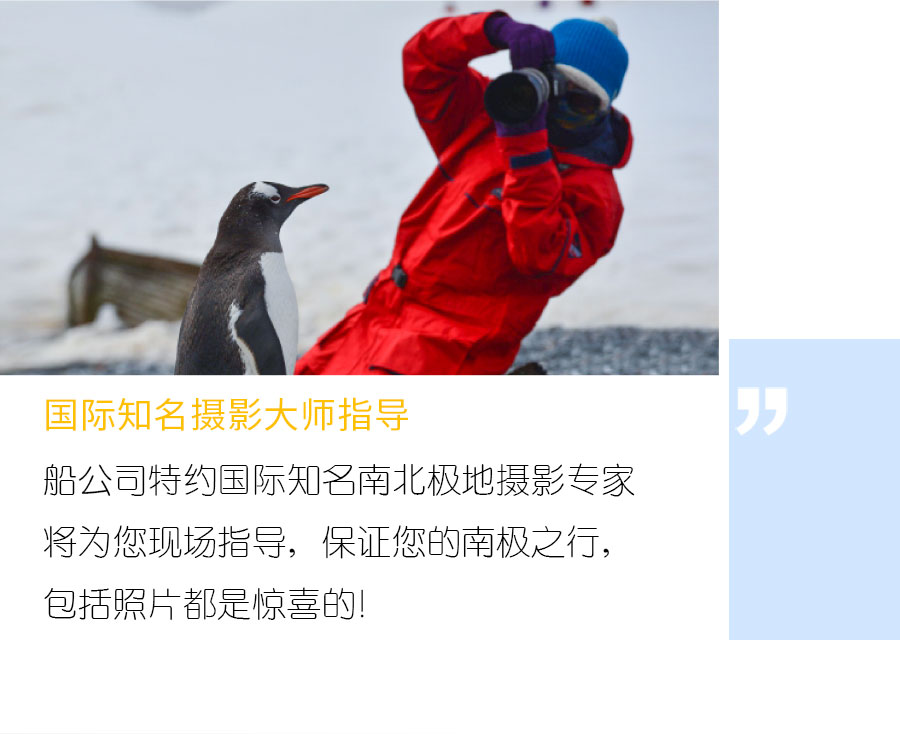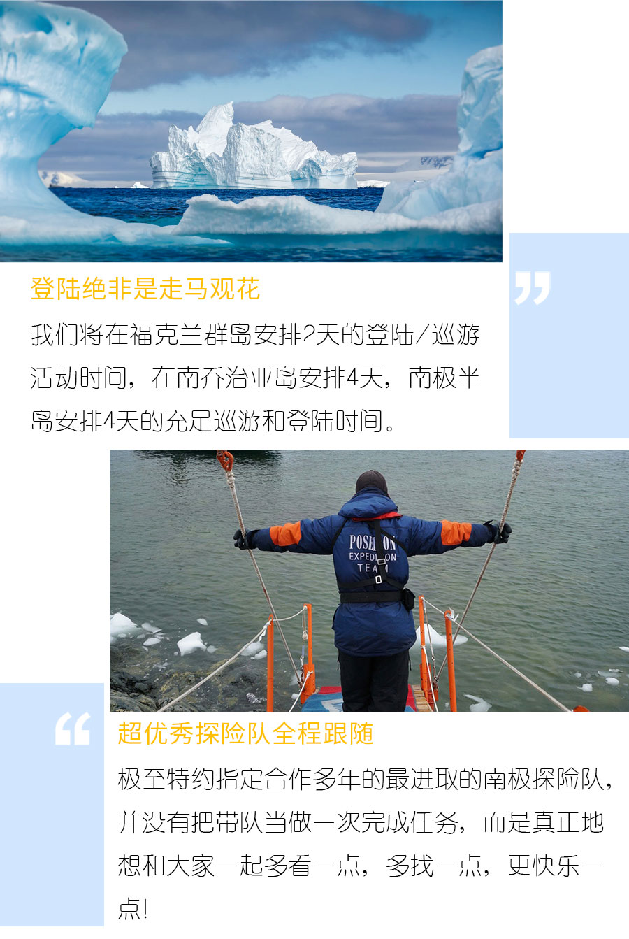 我们将有机会登陆南极大陆这个最美的白色星球,步行到企鹅点缀的海滩,攀上雪山顶鸟瞰南极的纯净壮美,在企鹅的栖息地与它们近距离亲密互动,乘坐橡皮艇在冰山群中穿梭巡游,还将看到鲸鱼和海豹成群游玩。