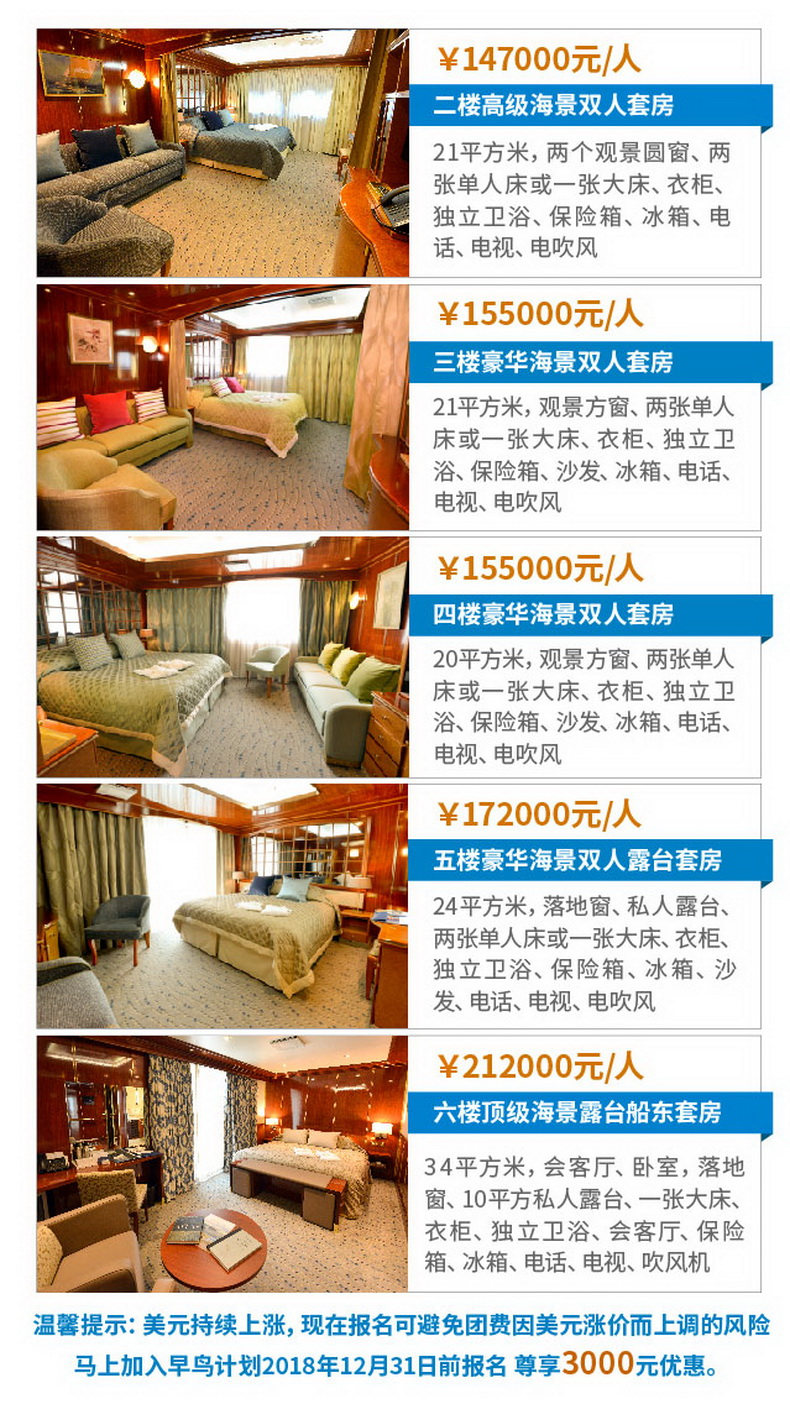 3. 南极抗冰船三人房/双人房的一人床位费用;