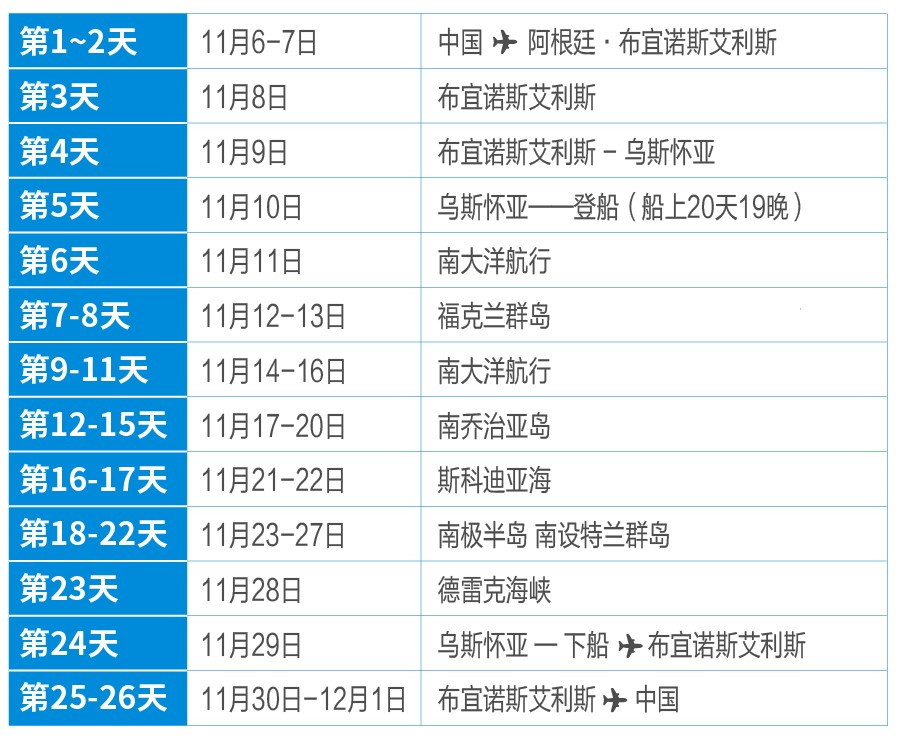 早上抵达乌斯怀亚,飞返首都布宜诺斯艾利斯。晚上前往国际机场乘机飞返中国。