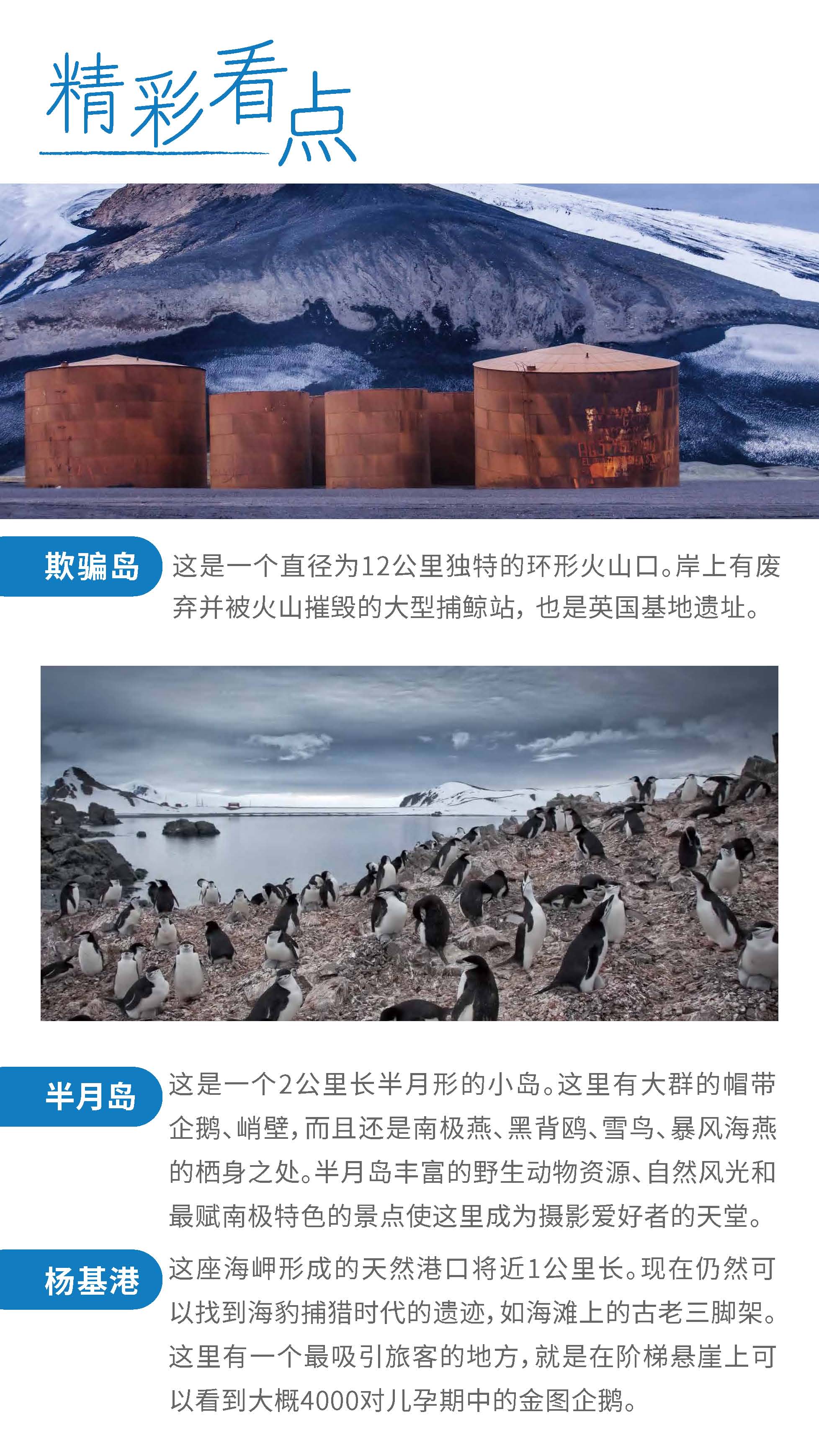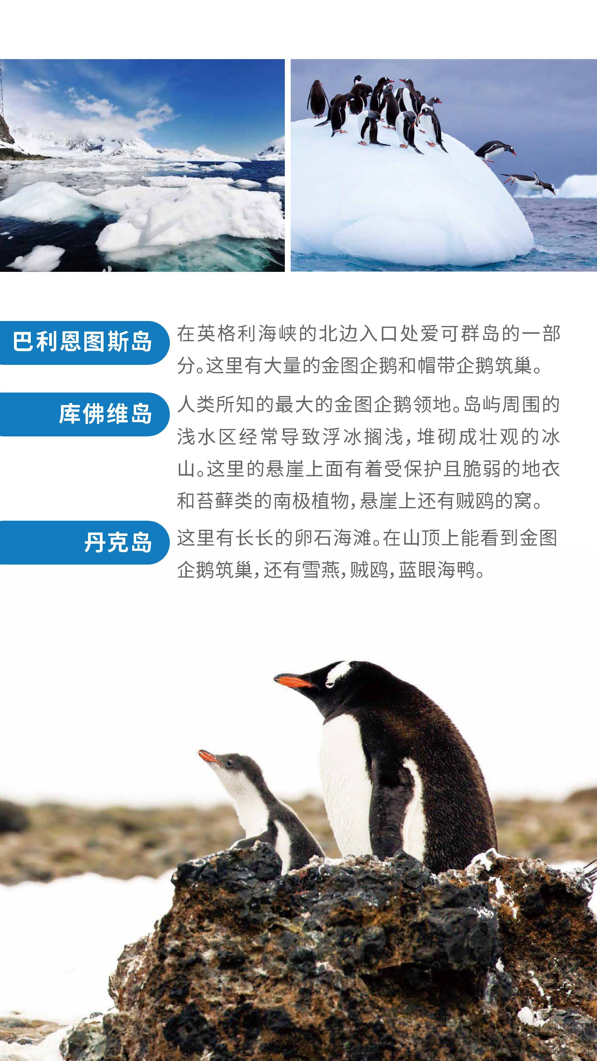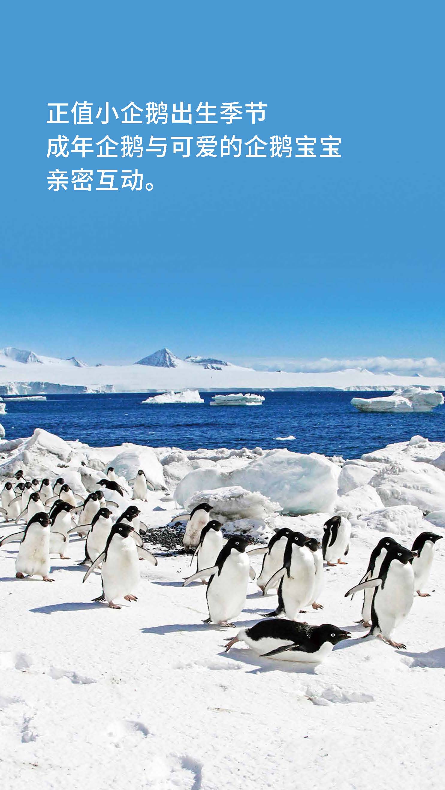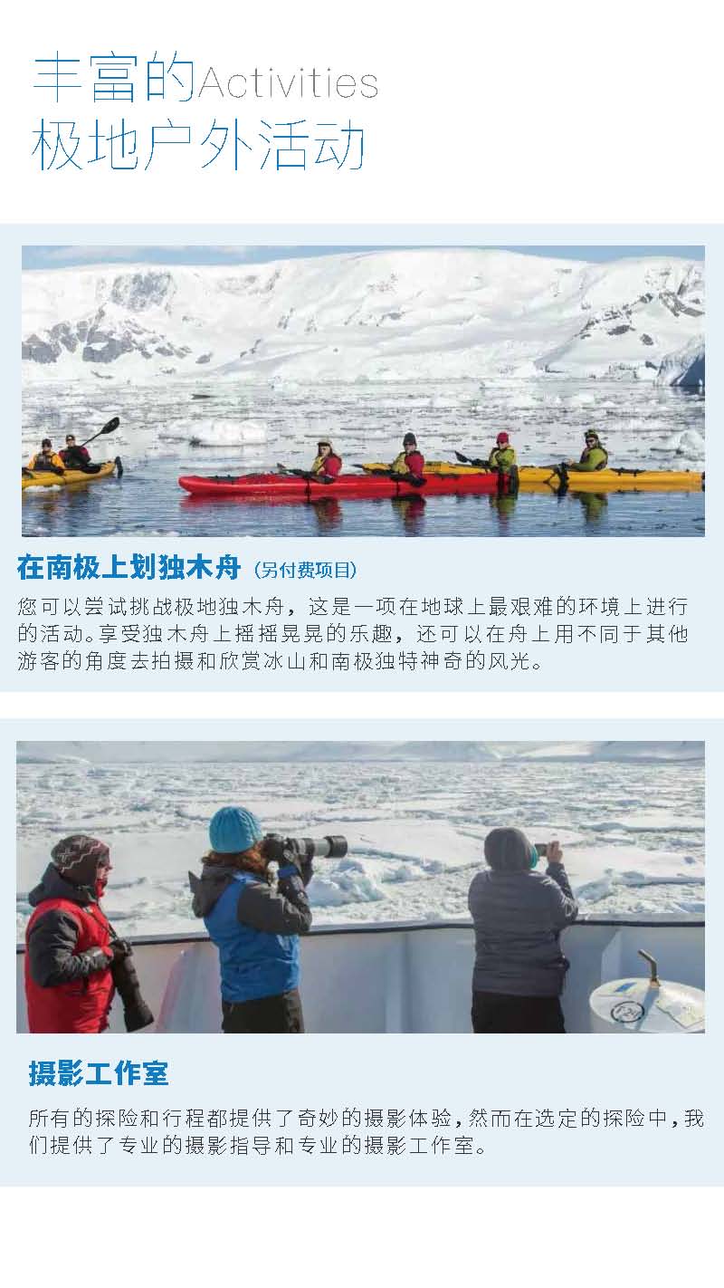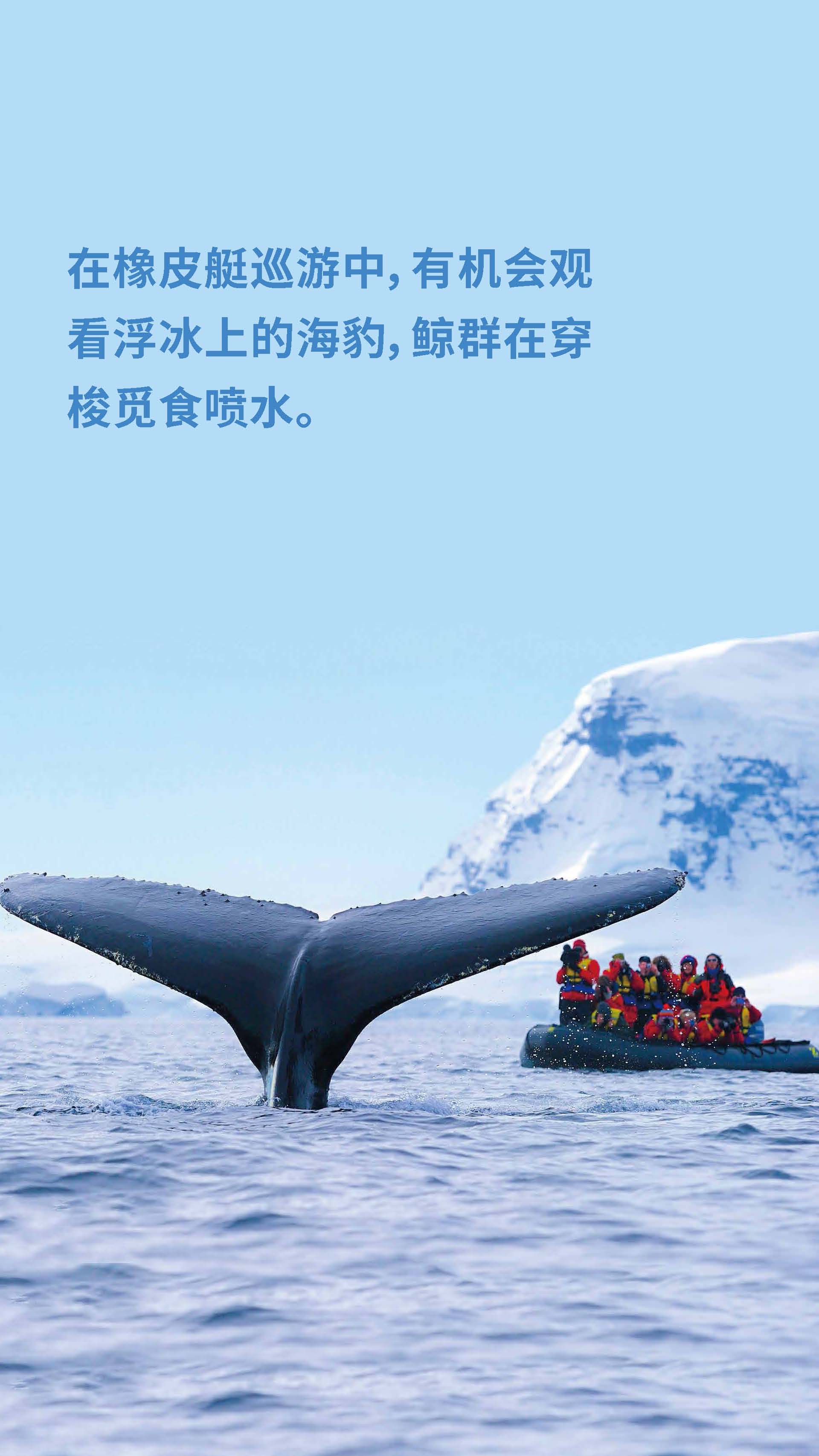 正值小企鹅出生季节,成年企鹅与可爱的企鹅宝宝亲密互动,近赏鲸群,近观海豹等野生动物,观赏罕见的极地海鸟,巡游冰山,探访南极科考站,品晚年老冰。泡茶、泡威士忌,挑战南极冰泳。