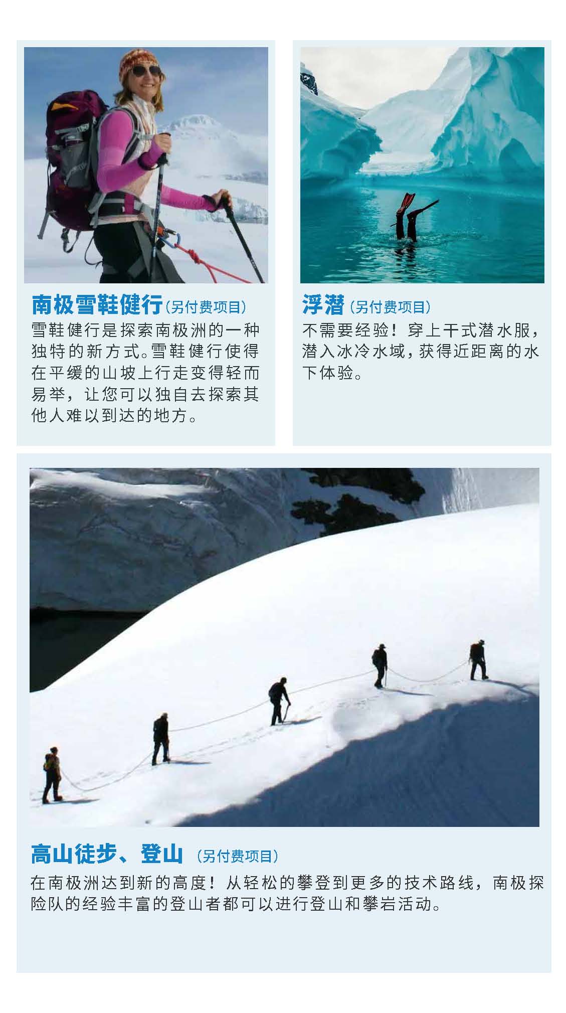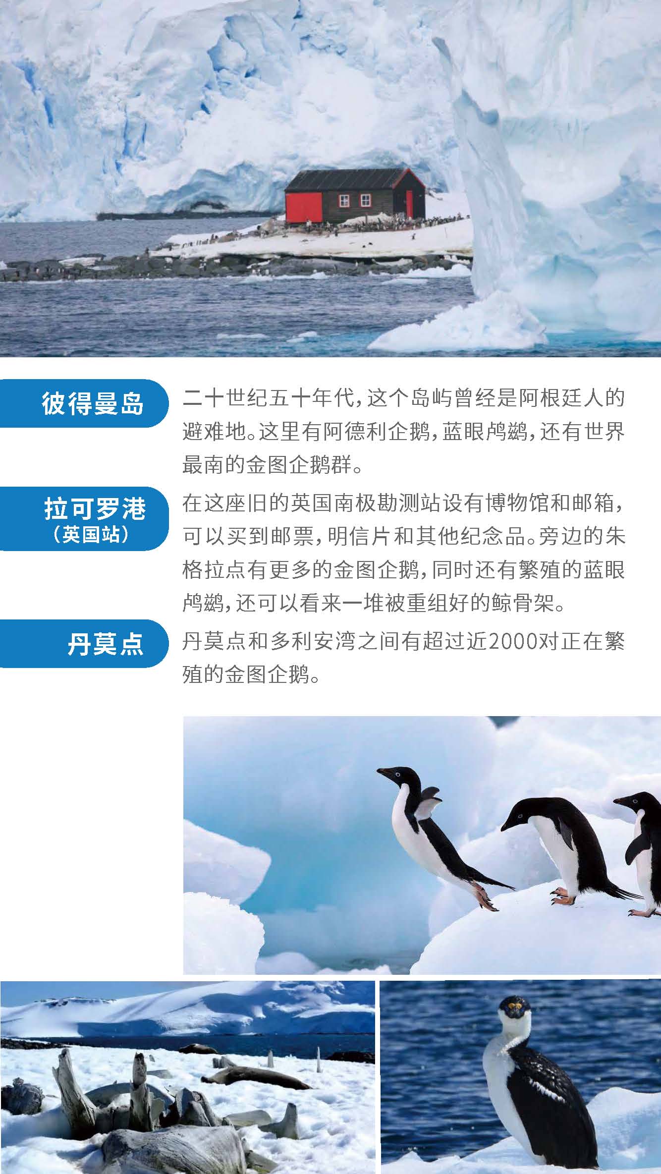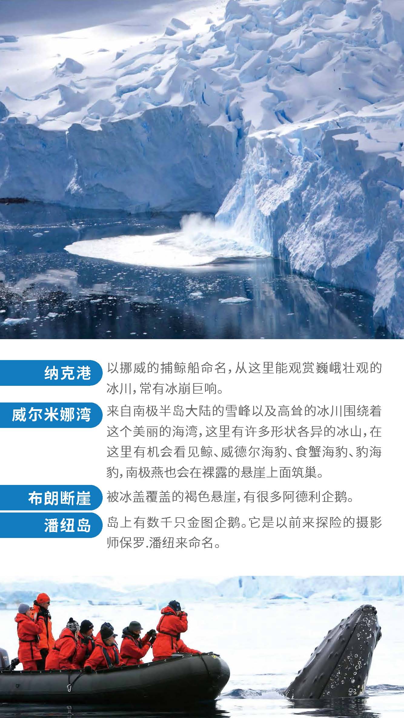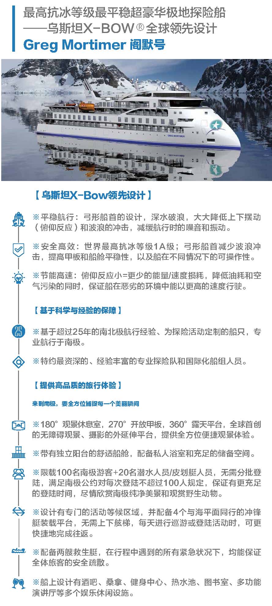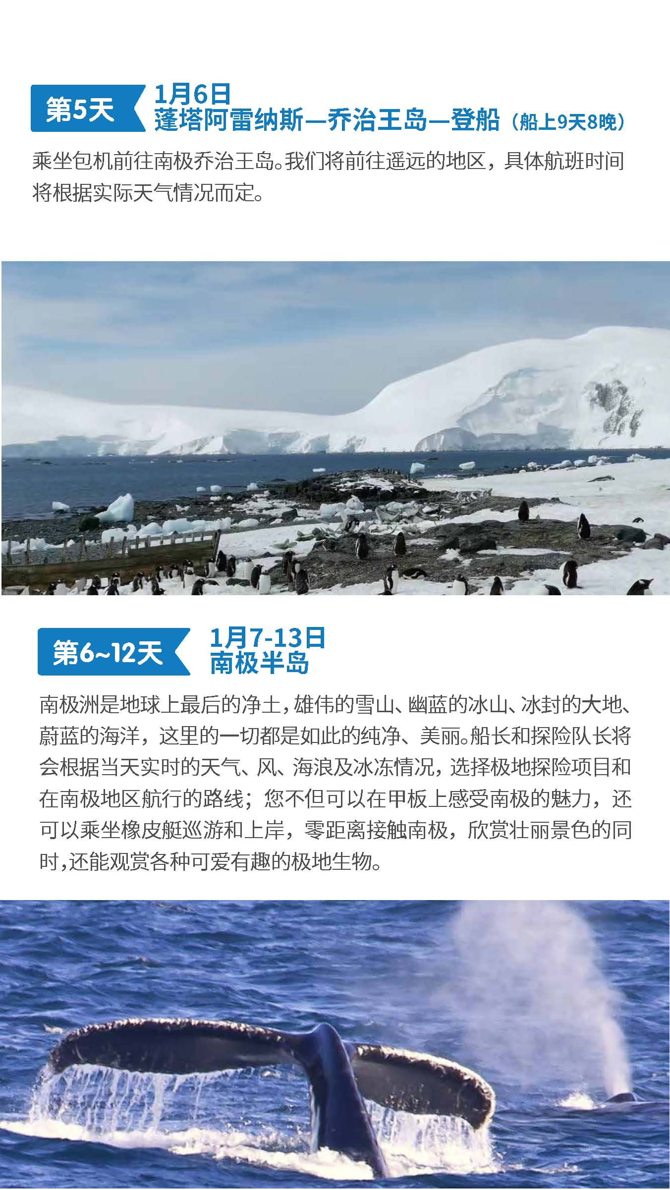 正值小企鹅出生季节,成年企鹅与可爱的企鹅宝宝亲密互动,近赏鲸群,近观海豹等野生动物,观赏罕见的极地海鸟,巡游冰山,探访南极科考站,品晚年老冰。泡茶、泡威士忌,挑战南极冰泳。