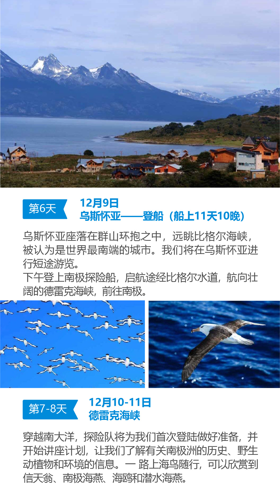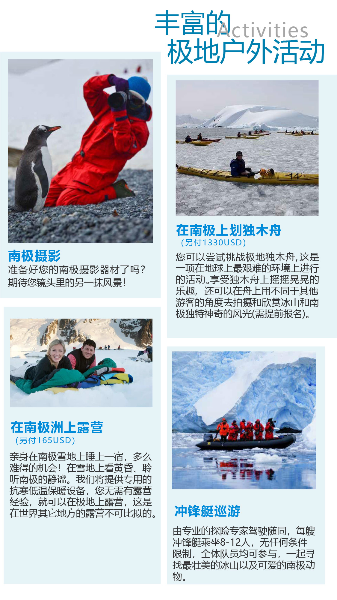 登陆南极大陆,造访南极科考站,也深入在海上冰山丛中巡游;搭乘极至优选的科技型豪华游轮,穿越德雷克海峡,仪式感满满;正值企鹅们的繁殖季节,看无数企鹅千姿百态;座头鲸到南极捕食的季节,近赏鲸群跃出海面;近观海豹等极地野生动物,一路上,观赏罕见的极地海鸟