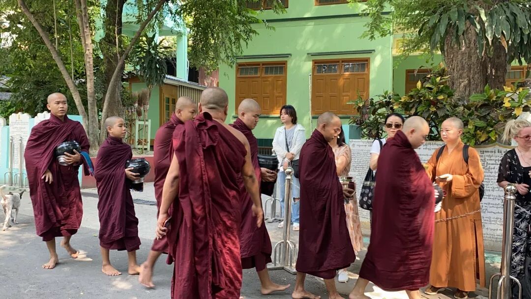 黑夜临近时,我们在酒店大堂等到了此行缘起之人尹立老师,他在曼德勒一个缅音叫ma sou yin的僧院短期出家。他告诉我们可以去佛学院感受一下千人托钵受供的场景,然后再去市区任意一个街道亲手供养那些托钵乞食的僧人。
