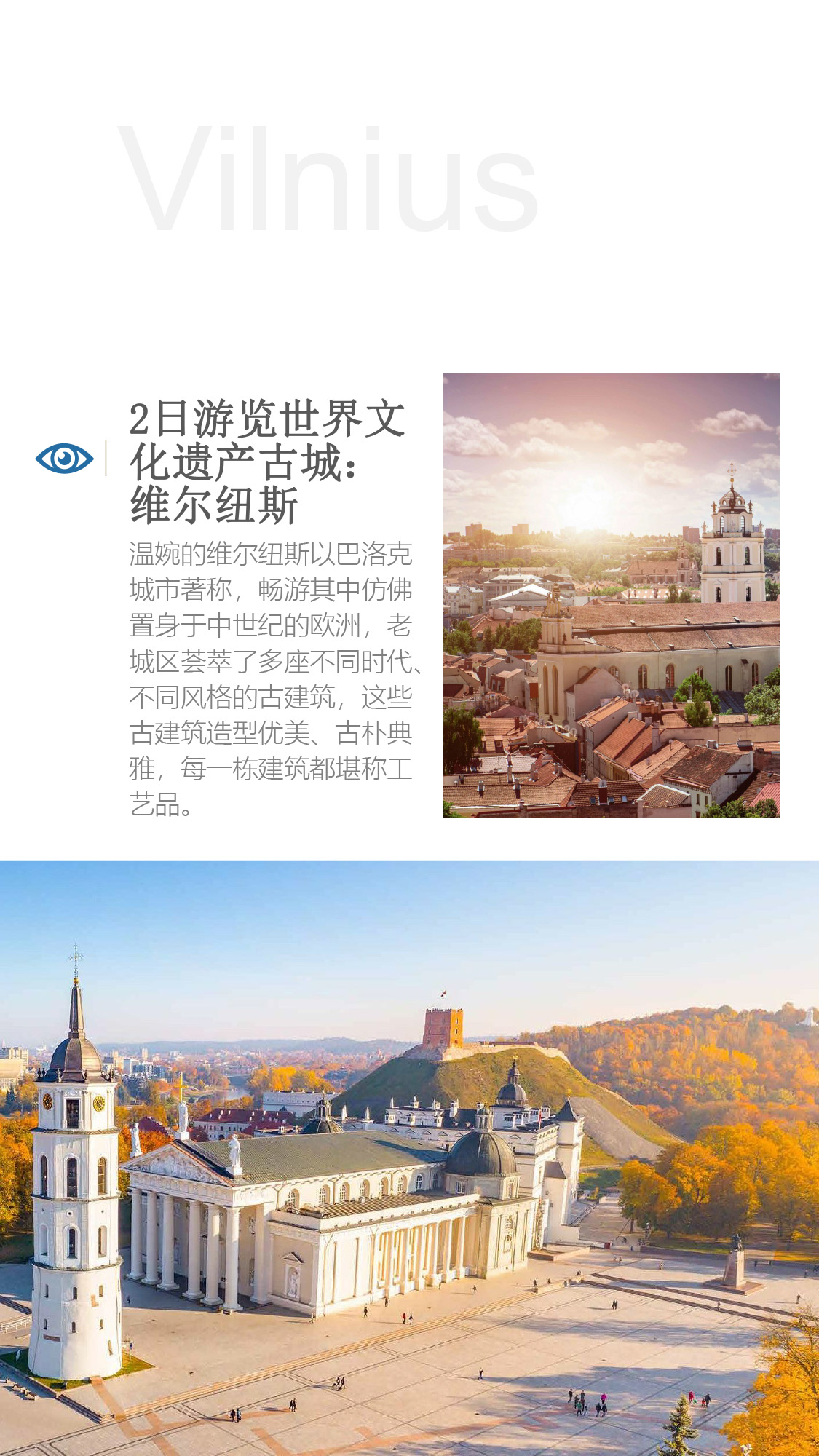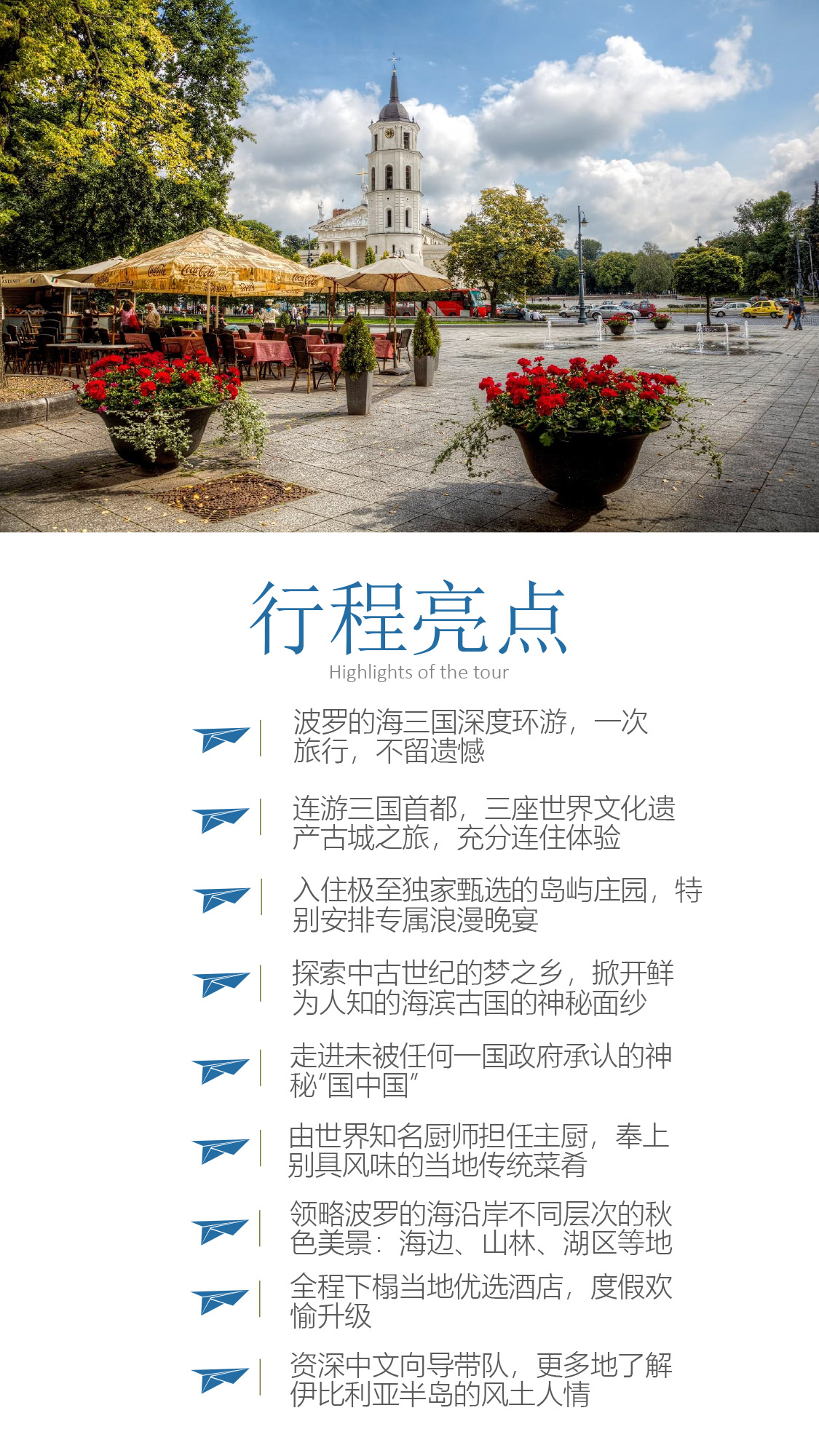 波罗的海三国深度环游,一次旅行,不留遗憾;连游三国首都,三座世界文化遗产古城之旅,充分连住体验;入住极至独家甄选的岛屿庄园,特别安排专属浪漫晚宴;探索中古世纪的梦之乡,掀开鲜为人知的海滨古国的神秘面纱;走进未被任何一国政府承认的神秘“国中国”;由世界知名厨师担任主厨,奉上别具风味的当地传统菜肴;领略波罗的海沿岸不同层次的秋色美景:海边、山林、湖区等地;全程下榻当地优选酒店,度假欢愉升级;资深中文向导带队,更多地了解伊比利亚半岛的风土人情
