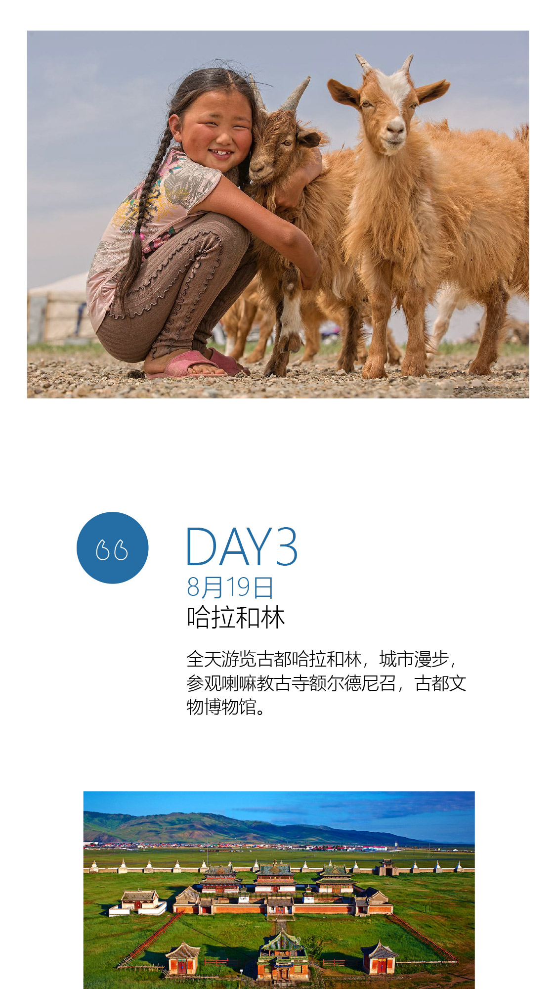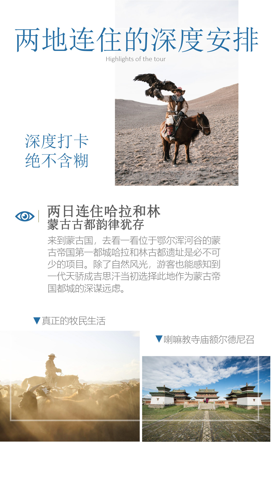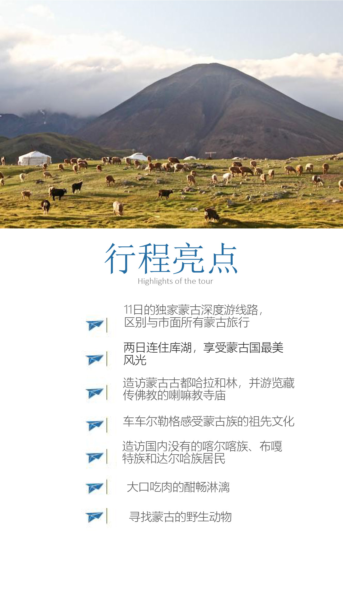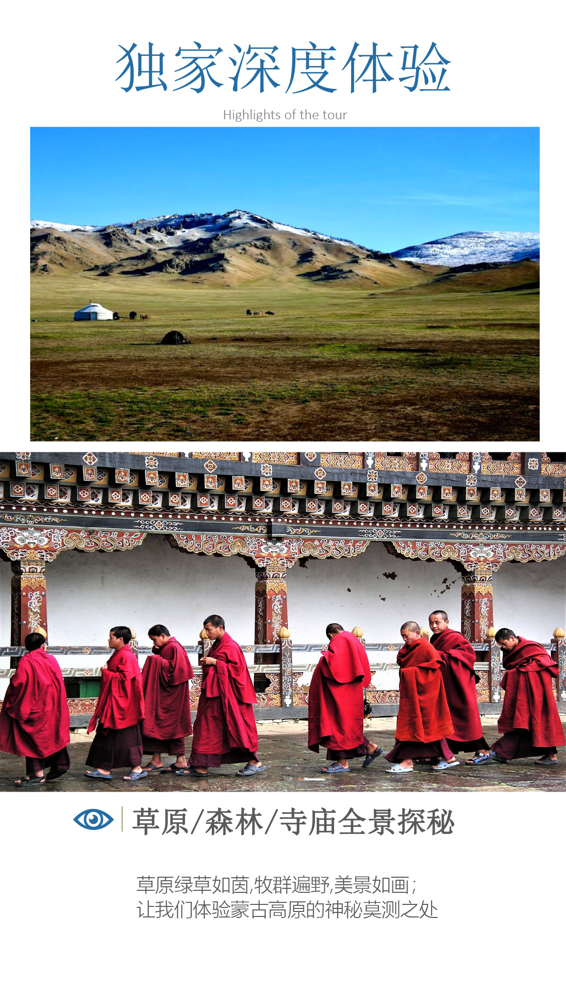 11日的独家蒙古深度游线路,区别与市面所有蒙古旅行;两日连住库湖,享受蒙古国最美风光;造访蒙古古都哈拉和林,并游览藏传佛教的喇嘛教寺庙;车车尔勒格感受蒙古族的祖先文化;造访国内没有的喀尔喀族、布嘎特族和达尔哈族居民;大口吃肉的酣畅淋漓;寻找蒙古的野生动物。