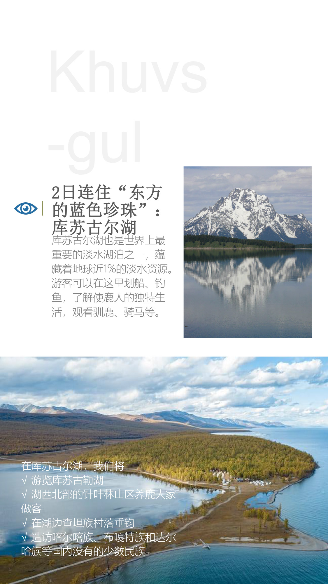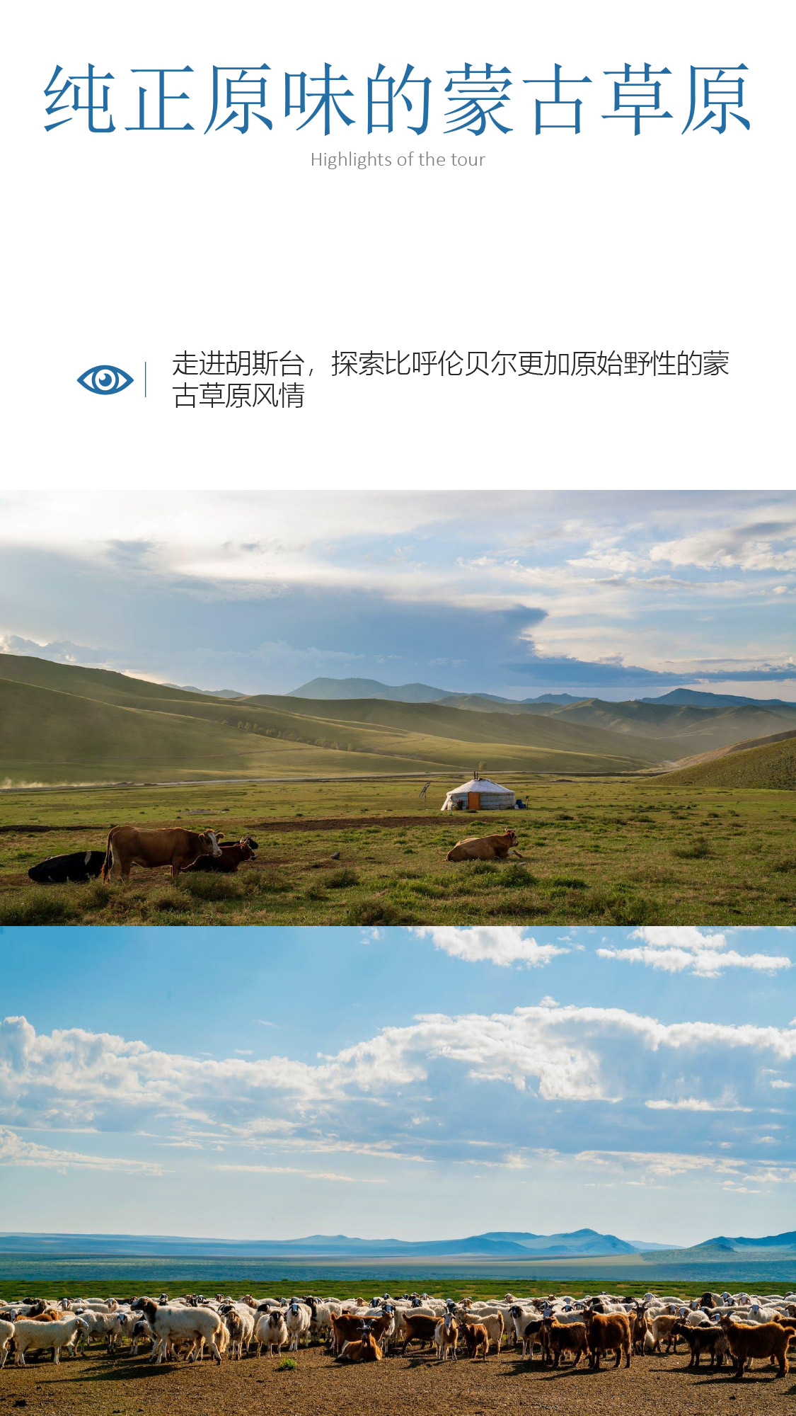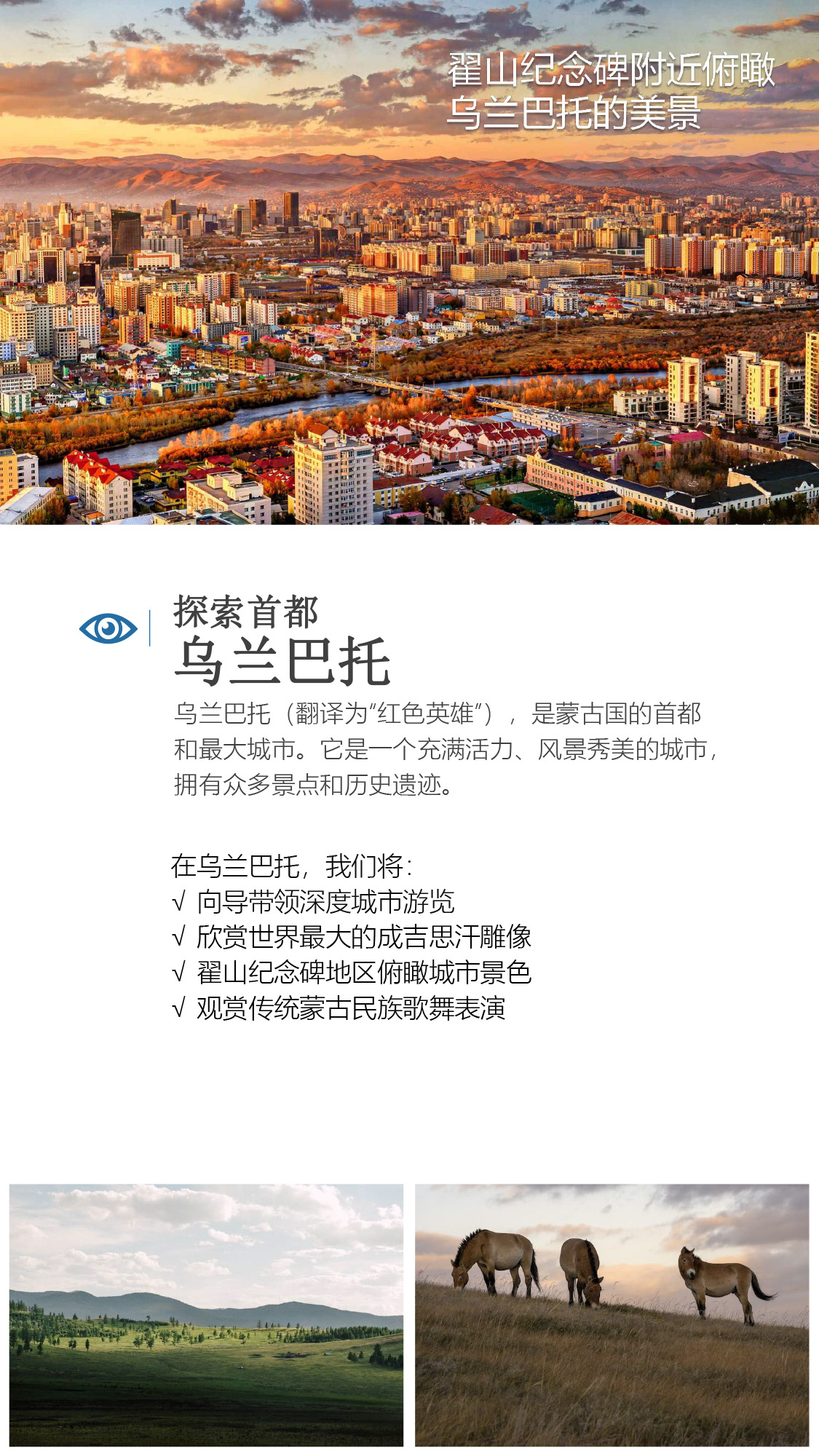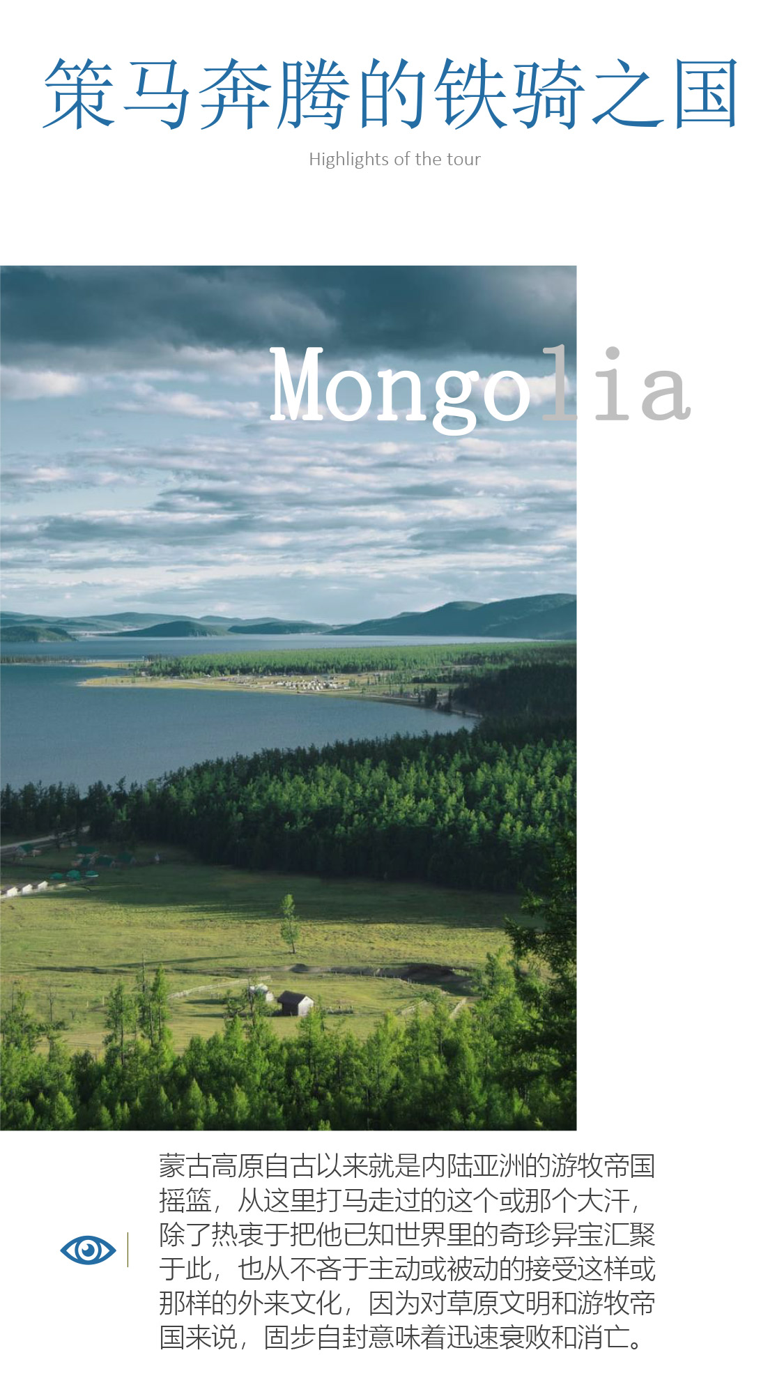 11日的独家蒙古深度游线路,区别与市面所有蒙古旅行;两日连住库湖,享受蒙古国最美风光;造访蒙古古都哈拉和林,并游览藏传佛教的喇嘛教寺庙;车车尔勒格感受蒙古族的祖先文化;造访国内没有的喀尔喀族、布嘎特族和达尔哈族居民;大口吃肉的酣畅淋漓;寻找蒙古的野生动物。