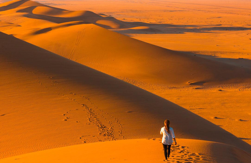 苏丝斯黎沙漠:每天的日出日落时分,太阳低光照射下,沙丘一半是殷红一半是黑暗,巨大的色彩反差和沙丘的曲线极具视觉冲击力,是拍摄、攀爬沙丘的最佳时间。
