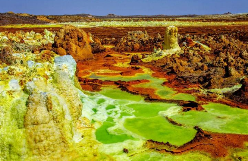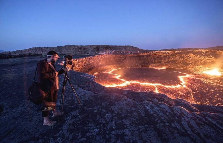 活火山形成的达纳吉尔凹地拥有一座持续活跃着的熔岩湖和一大片黄橙色相间的硫黄岩。