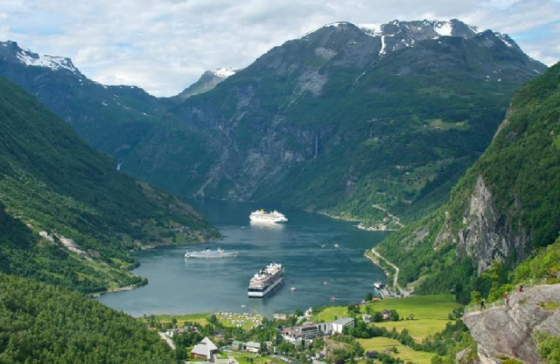 乘船游览盖朗厄尔峡湾。一路上可看到连绵不断的山谷,悬挂深涧中的巨大瀑布。登上观景台,感受峡湾地势雄伟高峻。