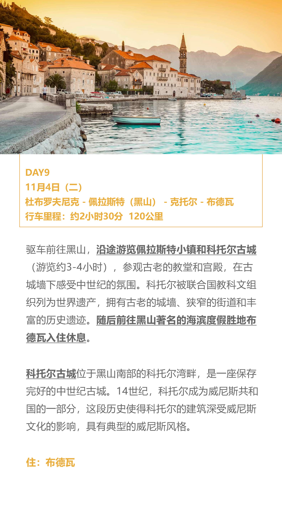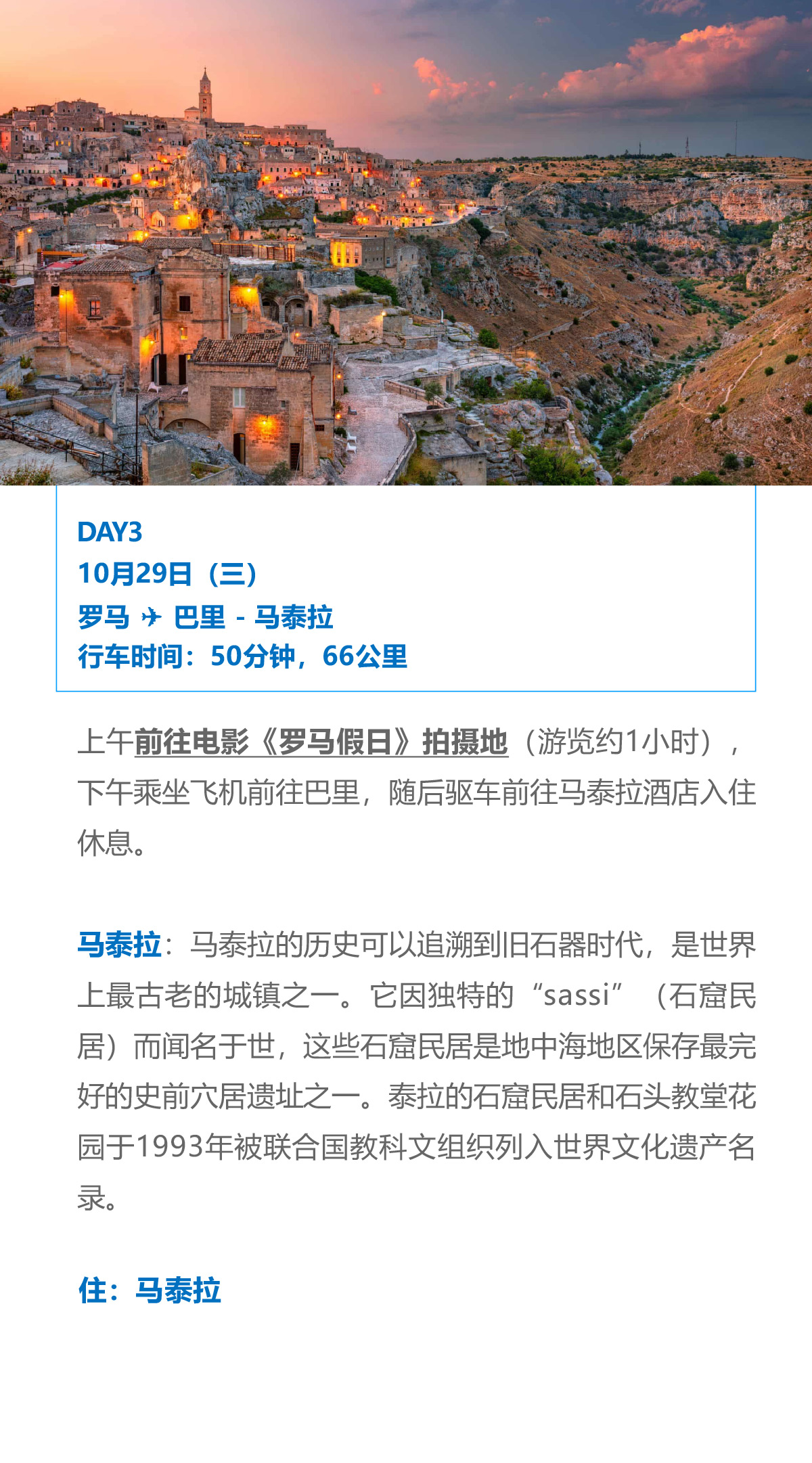 行程贯穿意大利南部+两袖珍国+巴尔干四国;美景、美食、宗教、文化四重极致体验;梵蒂冈:神性与艺术的永恒交响;圣门象征着赦免与重生,穿过圣门被认为能够 获得灵魂的净化与救赎;马泰拉——”洞穴之城“;君临城——杜布罗夫尼克;科托尔——黑山的“峡湾之心”;波黑的“桥之城”——莫斯塔尔;世界现存最古老的共和国(公元301年建国)——圣马力诺