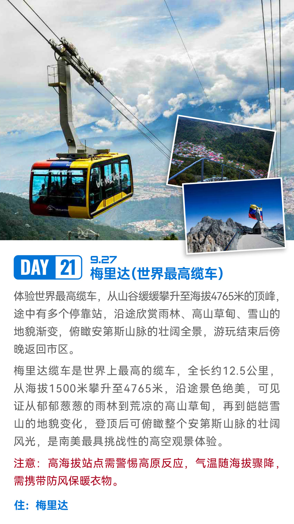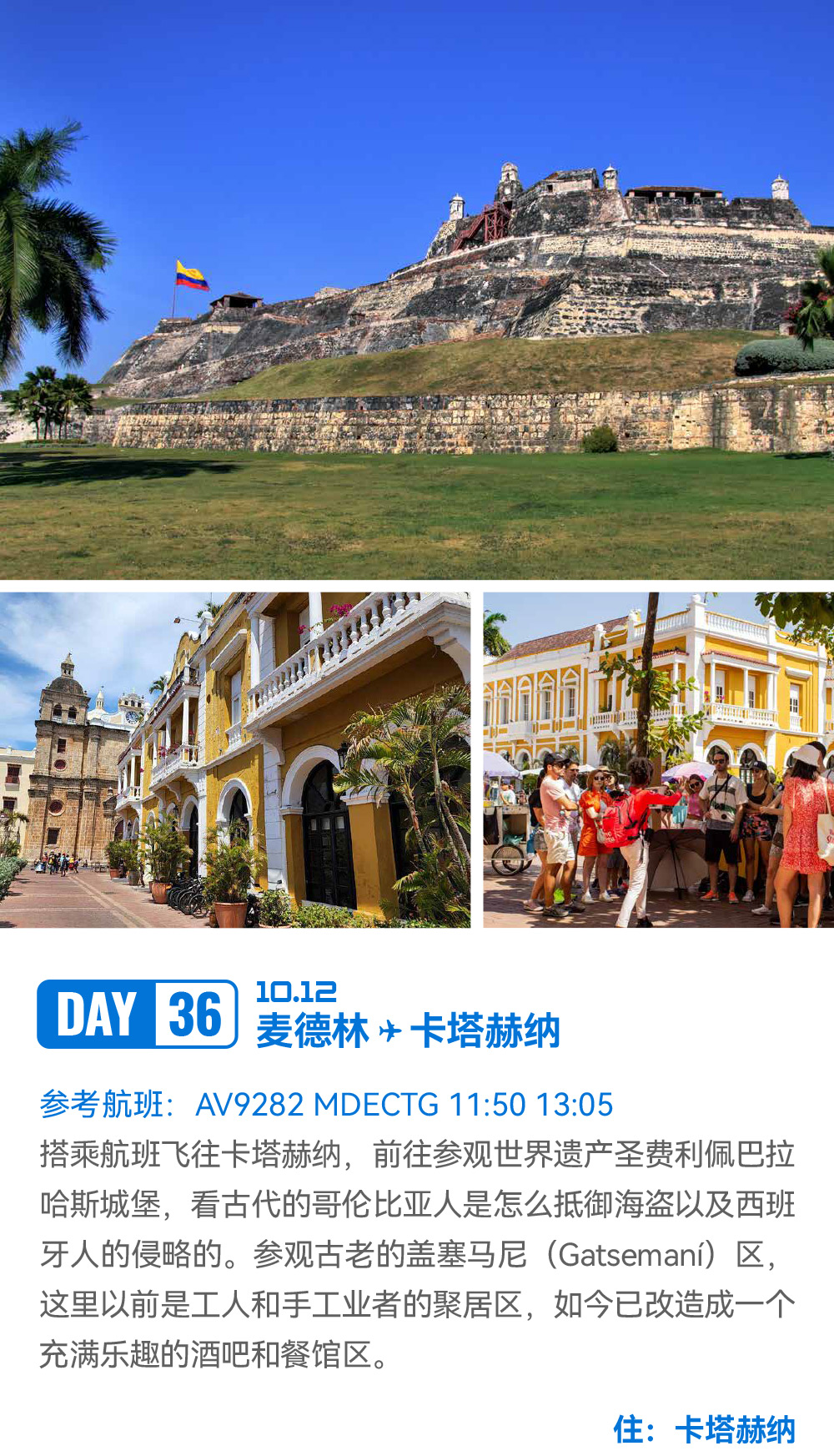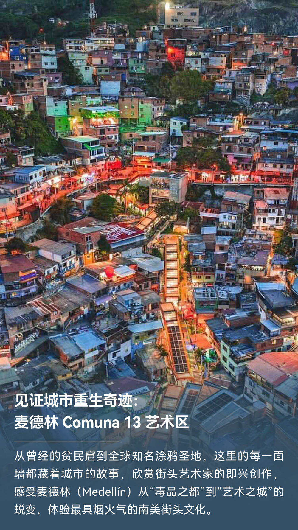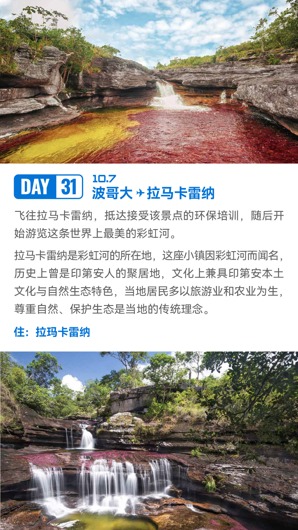 解锁世界落差最大瀑布:天使瀑布;邂逅世界最独特闪电奇观:卡塔通博闪电;漫步“液体彩虹”:彩虹河;畅游“沙漠与湖泊共生”奇景:千湖沙漠;登顶世界最高缆车:梅里达缆车;探秘殖民时代瑰宝:卡塔赫纳古城;见证城市重生奇迹:麦德林 Comuna 13 艺术区