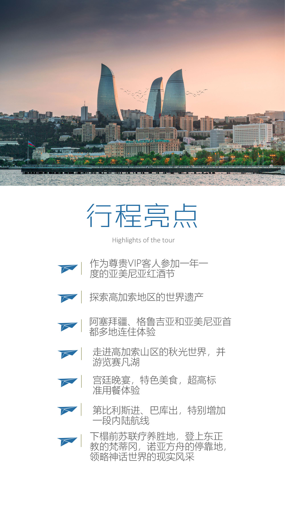 作为尊贵VIP客人参加一年一度的亚美尼亚红酒节;探索高加索地区的世界遗产;阿塞拜疆、格鲁吉亚和亚美尼亚首都多地连住体验;走进高加索山区的秋光世界,并游览赛凡湖;宫廷晚宴,特色美食,超高标准用餐体验;第比利斯进、巴库出,特别增加一段内陆航线;下榻前苏联疗养胜地,登上东正教的梵蒂冈,诺亚方舟的停靠地,领略神话世界的现实风采