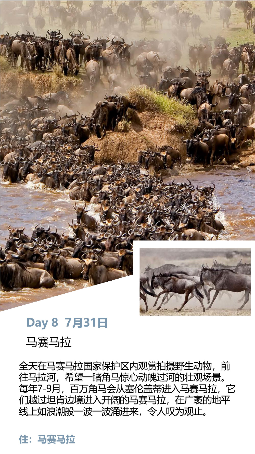 在最好的季节一网打尽双国联游;“雪山下的野性天堂”安博塞利国家公园;零距离接触野生动物,独一无二的互动体验;下榻塞伦盖蒂豪华营地,真正的非洲野奢游猎体验;连住三晚马赛马拉,最大化体验动物大迁徙;“火烈鸟天堂”纳库鲁湖国家公园