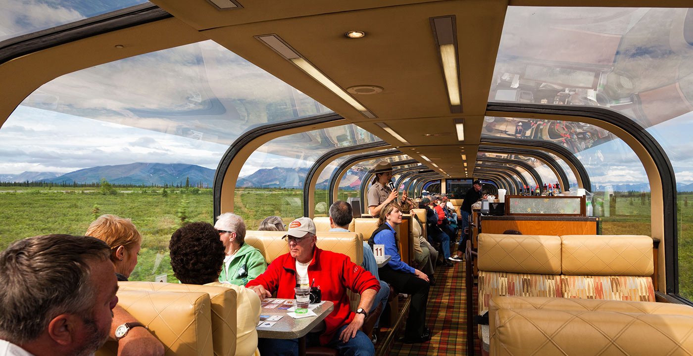 迪纳利之星:安排感受最豪华的金星车厢,舒适座椅,宽大的180度玻璃穹顶车窗,堪称移动观景平台,让游客尽情拍摄沿途美景。
