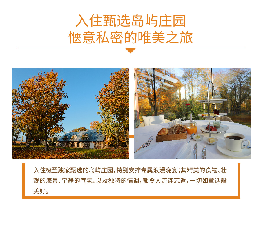 前往帕尔努,乘坐渡轮前往 萨尔玛岛,岛上有很多世界上独一无二的自然景色,岛上的小镇保留古朴的风貌,许多教堂与城堡从13-14世纪保留至今。入住极至独家甄选的岛屿庄园,特别安排专属浪漫晚宴。