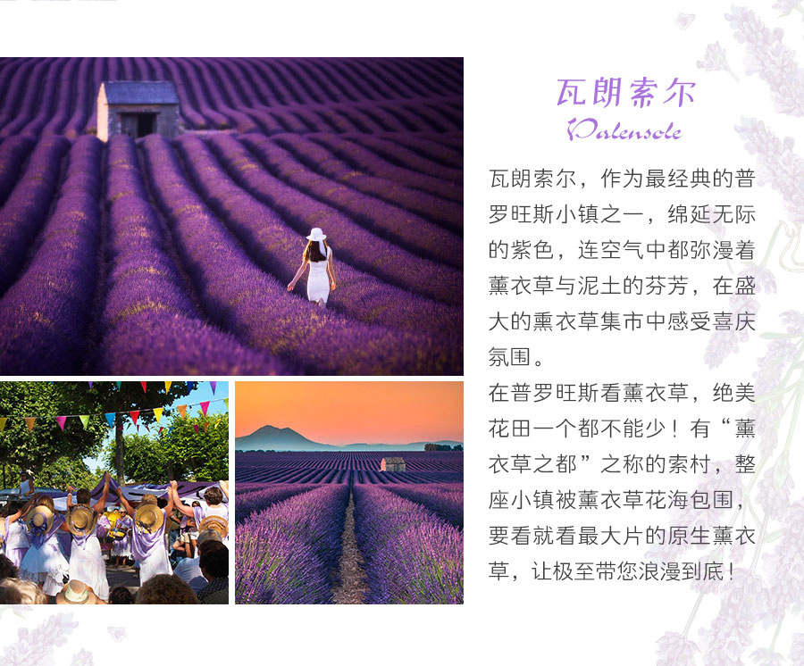 瓦朗索尔:瓦朗索尔地处高原,阳光灿烂,是最经典的普罗旺斯小镇之一,也是薰衣草种植最密集的地区之一,眼见所及全部都是紫色的薰衣草田,绵延无际宛如置身于天堂的梦幻感动,连空气中都弥漫着薰衣草与泥土的芬芳。