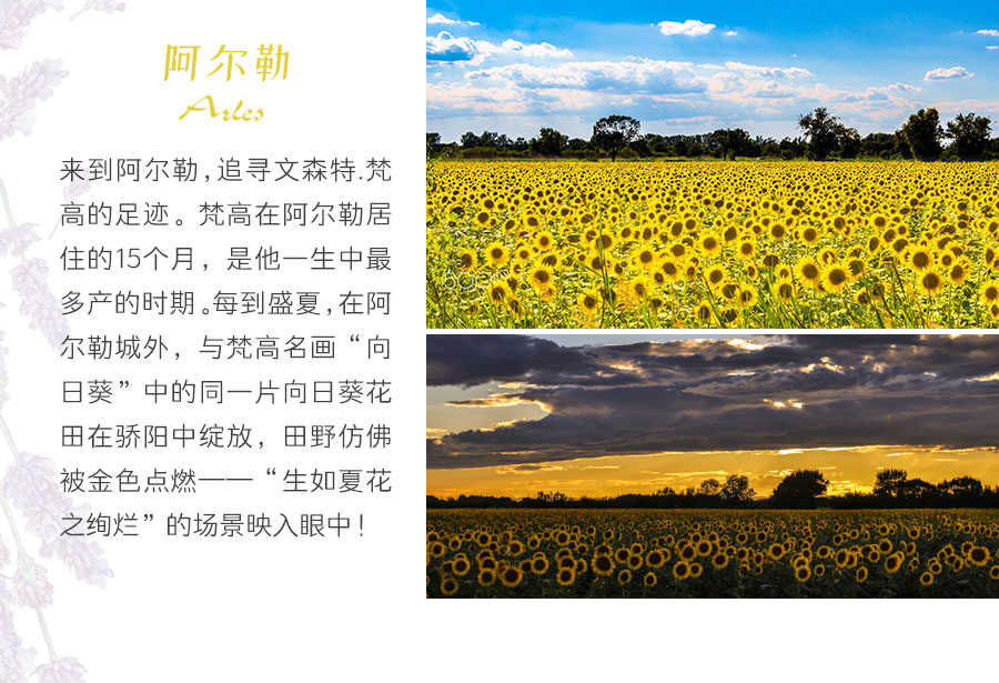 阿尔勒:印象派画家梵高在曾阿尔勒停留15个月之久,并且创作了三百幅油画,这是他一生中创作量最丰富的时期,其中大量的以向日葵为主题的作品让阿尔勒的向日葵花田成为了难以忘怀的文艺情节。