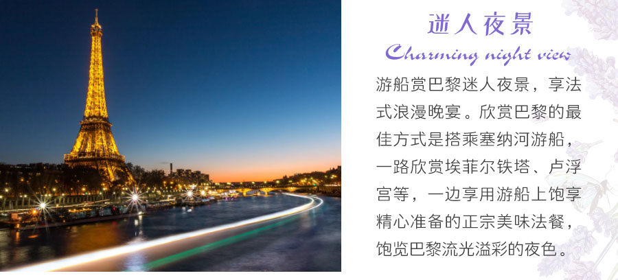 游玩国际知名影城 — 戛纳,在一年一度的法国戛纳电影节举办地驻足留影,寻找心仪的明星手印,漫步在建满豪华酒店和奢侈店的滨海大道,体验地中海风的味道。前往尼斯乘机飞往浪漫梦幻的法国首都—巴黎,晚上乘船游览穿巴黎而过的塞纳河,在船上欣赏了两岸的美丽风光和名胜古迹,享受观光晚宴。